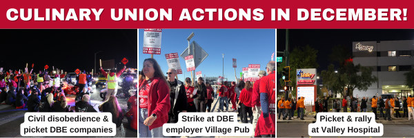 Del viernes 5 de diciembre de 2025 a las 5:00am hasta el s谩bado 6 de diciembre de 2025 a las 5:00am, la Uni贸n Culinaria encabez贸 una huelga de 24 horas en Village Pub, empleador de DBE, en el Aeropuerto Internacional Harry Reid (LAS).
