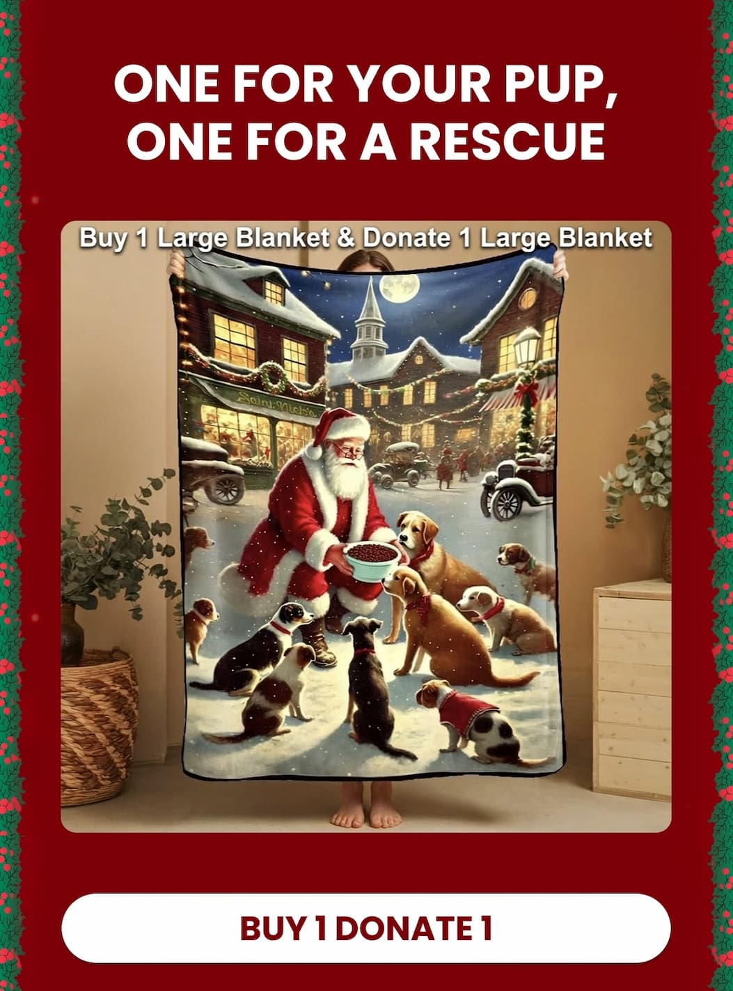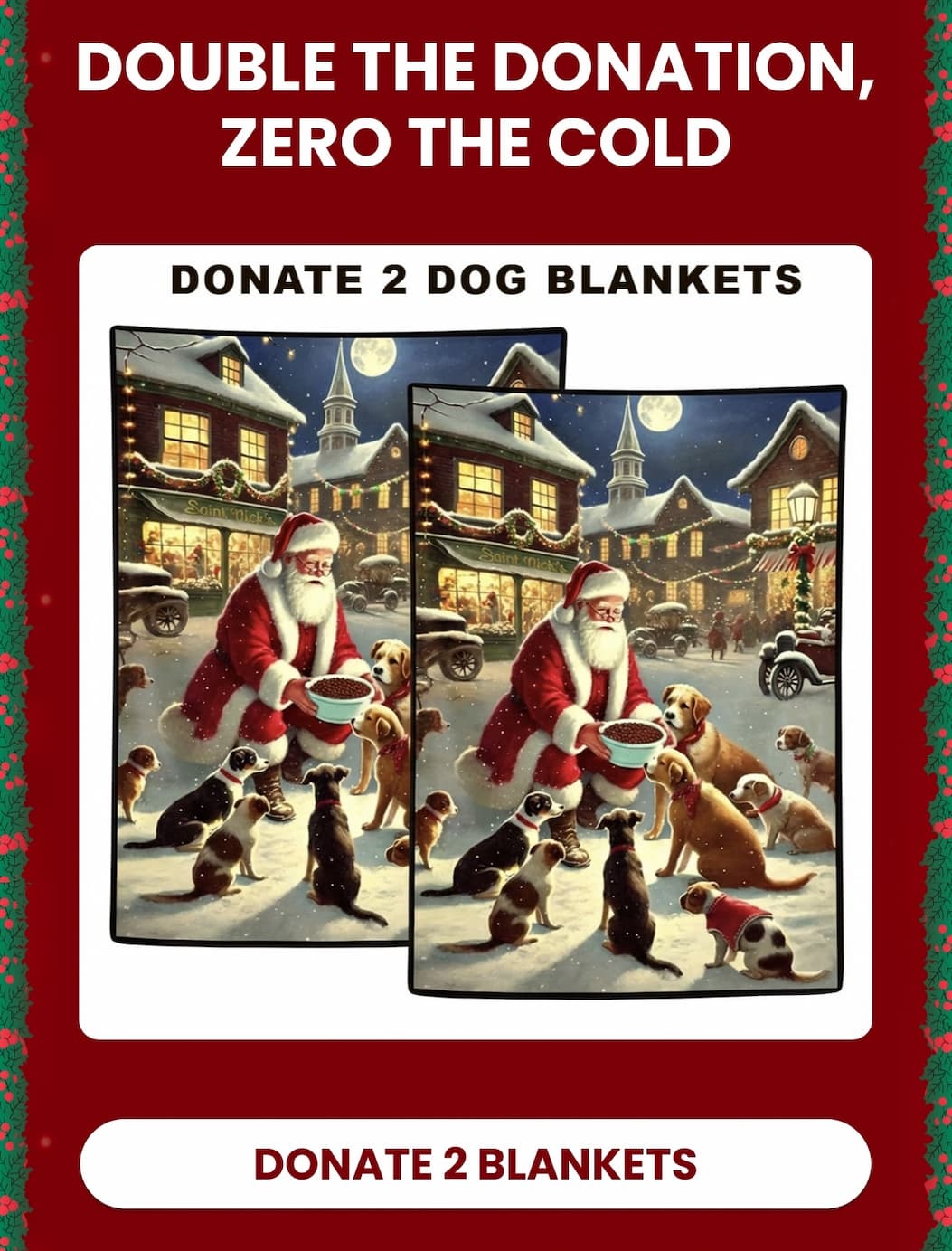 Option 1: Buy 1, Donate 1. Purchase a cozy "Santa’s Light of Hope" blanket for your own pup (or yourself!), and we will automatically donate a second blanket to a shelter dog in need.