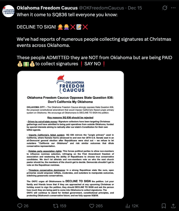 Right now, the only vocal opposition to SQ 836 is the Oklahoma Republican Party and your Oklahoma Freedom Caucus. They are urging voters to "decline to sign" the Left's petition to get their scheme on the ballot.