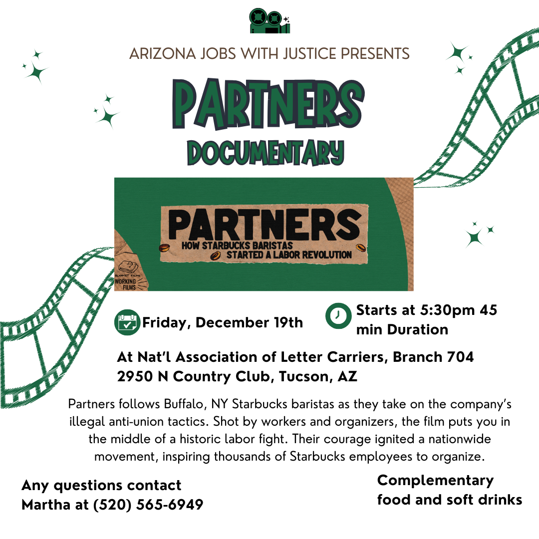 Join Arizona Jobs with Justice and Working Films for a screening of Partners, a film that tells the story of baristas in Buffalo, New York, who announce their intention to form a labor union and how Starbucks responds with an elaborate and illegal anti-union campaign. Featuring on-the-ground footage from workers and organizers, Partners takes us to the front lines of the historic union campaign that catalyzed America’s Gen Z labor revival.