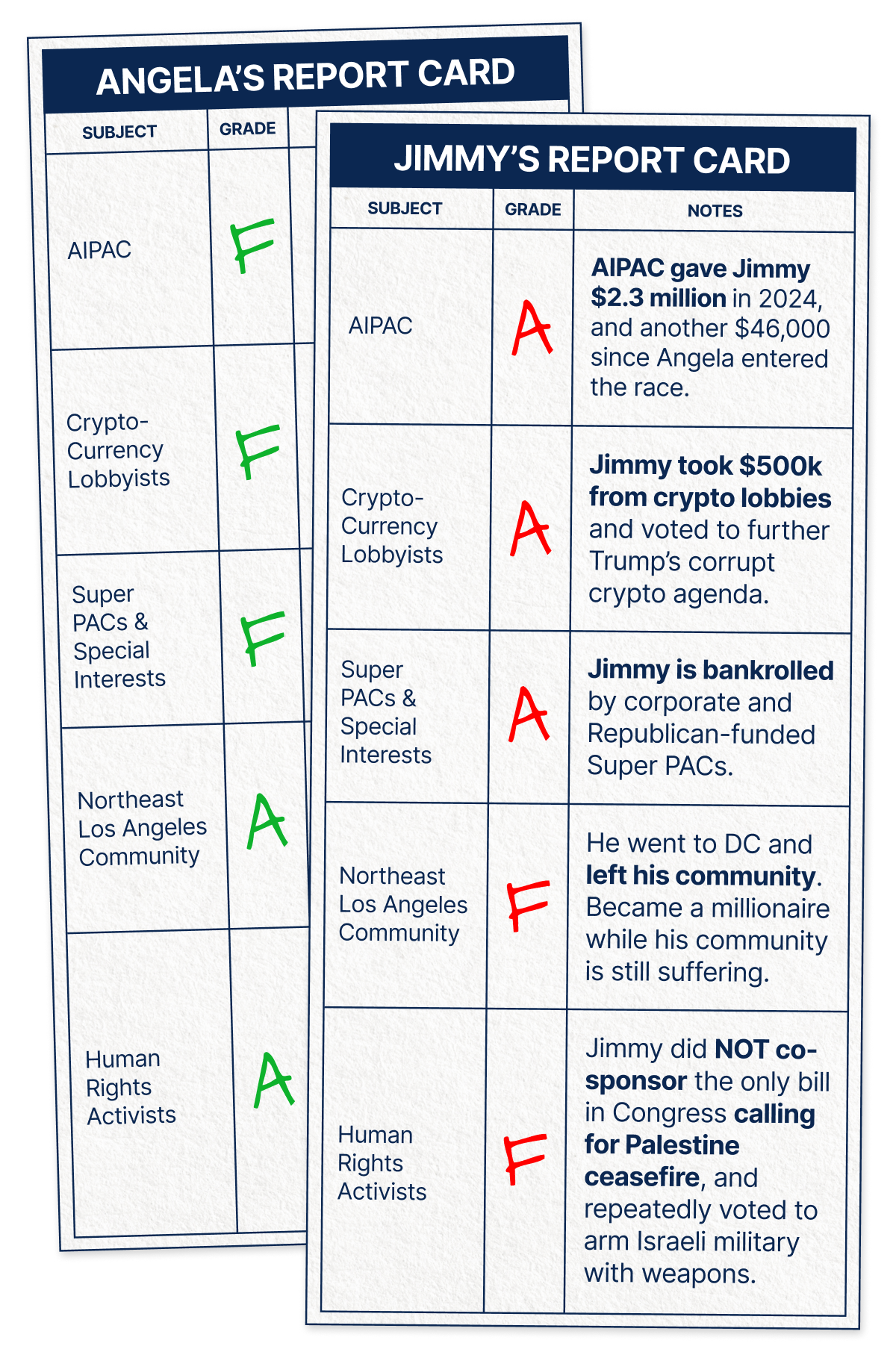 I’m not afraid to turn down big checks that don’t align with my values. I know that the power is in the people, not in corporations. That’s why I’m striving to win this race the right way and continue to be graded A for my stance on Palestine, human rights, and my work for my Northeast LA community.
