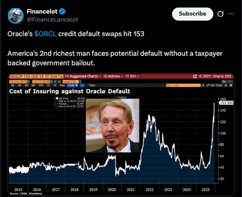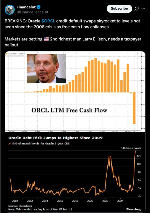 Oracle's tumble is a warning for investors they should heedOracle is staying true to its name sake. It is revealing hidden knowledge to us.The Capitalist is a reader-supported publicationReject Corporate Left Wing JournalismIn Michigan, blueprints for a colossal data center lie dormant, their promise of powering the next era of artificial intelligence now shrouded in uncertainty. Oracle, the software behemoth once synonymous with steadfast enterprise solutions, had trumpeted this $10 billion project as a cornerstone of its AI ambitions—a sprawling facility designed to house the computational muscle for generative AI models and cloud services. Yet, on a mid-December day in 2025, news broke that Blue Owl Capital, a key private lender, had abruptly withdrawn from financing discussions, sending Oracle’s shares into a tailspin. This wasn’t just a corporate hiccup; it was a stark reminder of how the AI hype machine, fueled by press releases and lofty projections, is colliding with the unforgiving realities of debt, future obsolescence, and market skepticism. As investors fled, Oracle’s stock plummeted more than 5% in a single session down to $177, capping an 18% monthly decline that has contributed to a nearly 50% tumble from their September high of $345.72. What had began as a narrative of boundless innovation now looks like anything but. Oracle’s descent underscores a broader tension in the tech landscape, where aggressive expansion meets financial fragility. The company’s pivot to AI, heralded by former CEO Safra Catz in earnings calls as a “once-in-a-generation opportunity,” involved a frenzy of deal-making that scaled up its data center footprint at breakneck speed. Just months earlier, Oracle had inked partnerships for similar ventures in Texas and New Mexico, collaborating with Blue Owl on facilities valued in the billions. The Michigan project alone aimed to deliver nearly one gigawatt of power capacity, enough to rival small nuclear plants, to support hyperscale AI training. These deals were pitched as transformative, with Oracle projecting $100 billion in annual cloud revenue by the end of the decade. But the scale masked underlying vulnerabilities: unlike peers such as Microsoft or Amazon, Oracle lacked the internal cash flows to self-fund such endeavors, relying instead on a web of external financing that now appears increasingly shaky. At the heart of Oracle’s strategy lay innovative but risky financing mechanisms, blending traditional debt with off-balance-sheet leases so as to sidestep immediate capital outlays. By November 2025, the company’s lease commitments had ballooned to $248 billion, a nearly 150% increase from prior levels, primarily tied to long-term data center and cloud capacity agreements spanning 15 to 19 years. According to Oracle’s quarterly SEC filing, these obligations were structured to accommodate surging AI demand, allowing the firm to expand without diluting equity or tapping reserves. This approach mirrored a broader industry trend, where tech giants outsource infrastructure risks to lenders and developers. Oracle supplemented this with bond issuances and partnerships, maintaining a BBB investment-grade rating on its debt. Yet, critics argue this model creates hidden leverage: total debt, including short- and long-term obligations, exceeded $111 billion by August, up sharply from the previous year. When Blue Owl balked at the Michigan deal—despite successful prior collaborations—the fragility became evident, exposing Oracle to refinancing risks in an uncertain environment. Investor reactions were swift and unforgiving, amplifying concerns over Oracle’s debt sustainability. Following the Financial Times report on the financing deal collapse, shares dove more than 5%, extending a post-earnings rout where costs outpaced revenue growth and cash burn exceeded forecasts. Credit markets echoed the alarm: Oracle’s five-year credit default swap (CDS) spreads surged to 139 basis points, their highest since the 2009 financial crisis, signaling heightened perceptions of a default risk. Analysts at firms like Morningstar noted that these spreads could climb to 150 basis points in short order, and they promptly did. Morningstar also views Oracle as a “canary in the coal mine” for Big Tech’s debt-fueled AI spree. The company’s insistence that negotiations with an alternative equity partner were on track did little to quell fears; instead, it highlighted a dependency on fickle external capital. Questions pivoted, where once they were all about growth metrics, now it was about balance sheet health. Oracle’s expansion that had been described as a “once-in-a-generation opportunity,” now looked a lot more like “building castles in the air.” It should also be noted that while Oracle’s decline was spectacular on a sheer percentage basis, the really concerning part of the tumble was the speed at which it happened. Ai if you listen to the chattering press is supposed to be the glittering future, but a major player in a supposedly burgeoning and rapidly growing industry managed to lose 50% of its value in barely 3 months. That sort of whiplash is usually not seen outside of the crypto space and for it to happen to such an established name as Oracle alludes to just how fragile their place in the AI sector can be. This turmoil also rippled far beyond Oracle, exposing emerging systemic risks in the AI sector where financial interconnections and investor sentiment create a domino effect. On the day of the plunge, the Nasdaq Composite fell sharply, dragged down by AI-linked stocks: GE Vernova tumbled nearly 8%, Broadcom shed 3%, and Nvidia dipped 2%, with ASML, TSMC, and AMD also declining amid doubts over AI financing viability. The S&P 500’s top 10 stocks, which now comprise 41% of its total market cap, amplified the fallout, underscoring concentration risks in an AI-driven market. Bad news for one player—whether it be Oracle’s 