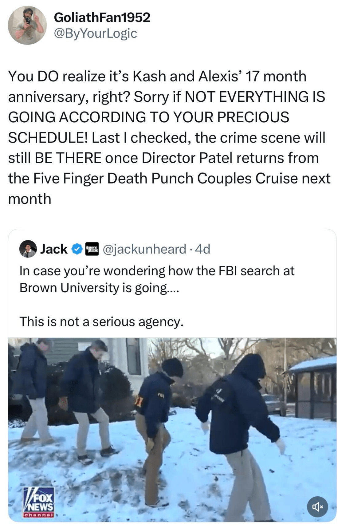 News like this is why we built The Feed: to analyze the politics, expose underreported trends, and back the creators who aren’t waiting for permission to tell the story. If that sounds like your kind of journalism, back it here: Donald Trump’s decision to appoint two racist podcasters to lead the FBI was never going to work out well, and Director Kash Patel’s tenure has been as incompetent and humiliating as we could have expected. But behind the buffoonery and the scandals is the quiet transformation of one of our most important law enforcement agencies into another arm of the Trump administration’s repression machine, twisting the law and the truth in order to target minorities and build fictional narratives to justify an authoritarian crackdown. Time to log on. Earlier this week, the FBI was conducting a manhunt to find the perpetrator of the recent mass shooting at Brown University. Trump’s racism czar Stephen Miller’s equally horrible wife Katie Miller decided this was a good time to release a podcast episode with FBI director Kash Patel and his girlfriend, unspectacular country musician Alexis Wilkins, in which she interviews them about the ways his silly, trivial little law enforcement work interferes with their beautiful love story. During the interview, Patel shrugged off criticism about him using FBI resources to go visit his girlfriend, saying that “If I was actually abusing it, I would go see every one of her shows. I think I get to like 15%.” Unsurprisingly, this did not go over well in both social and legacy media, which were already on Patel’s case for once again prematurely declaring that the FBI had caught a suspect in the Brown shooting and then was forced to walk it back hours later. The perpetrator would later be identified thanks to a keen-eyed Redditor, as the father of Charlie Kirk’s killer did during Patel’s last manhunt. An avalanche of mockery and criticism followed. “I know it’s stupid but I just can’t get over the Kash interview w/ his girlfriend while the Brown manhunt is happening,” conservative podcast host Saagar Enjeti posted. “It truly is one of the craziest, most narcissistic, and ridiculous things I’ve ever seen in Washington.” Well, how’s Deputy Director Dan Bongino doing, you might be wondering? The answer is not great. After being forced to work a real job for ten whole months for possibly the first time in his life, Bongino is calling it quits and resigning. “I gave up everything for this. My wife is struggling. I’m not a victim. It’s fine. I’m proud I did this. But if you think we’re there for tea and crumpets...we’re there all day. I stare at these four walls all day separated from my wife in DC,” whined Bongino to Fox and Friends. Yeah, dude, it’s called going to work. We’d all like to spend time with our families all day. One might think that after so many humiliations and such obvious incompetence, Kash Patel would soon be following him out the door. After all, Salon reports that “according three different sources inside the FBI, the once-respected federal law enforcement agency is ‘in shambles.’ Morale is at an ‘all-time low,’ said one 30-year veteran, adding, ‘the cause is at the top.’” But nope! Donald Trump recently reaffirmed his confidence in Patel, likely because Stephen Miller told him to. According to the New York Times, Stephen Miller wants Patel to stay because “he considers Mr. Patel to be a compliant purveyor of his directives on personnel and policy matters.” In other words, Patel is a weak and obedient patsy who will happily implement Stephen Miller’s far-ranging campaign to manufacture a left-wing terrorist conspiracy in order to justify a totalitarian crackdown. That campaign officially began with the Trump administration-issued directive called NSPM-7 on September 25th. Officially titled “Countering Domestic Terrorism and Organized Political Violence,” the memo orders all federal agencies to dedicate their efforts to target individuals and groups who exhibit any of the following indicators: “anti-Americanism, anti-capitalism, anti-Christianity, support for the overthrow of the United States Government, extremism on migration, extremism on race, extremism on gender, hostility towards those who hold traditional American views on family, hostility towards those who hold traditional American views on religion, and hostility towards those who hold traditional American views on morality.” These indicia are so vague and unspecific that they encompass any and every political opinion or belief that doesn’t fit in Stephen Miller’s white supremacist worldview, and it is an obvious blueprint for prosecuting anyone who isn’t a diehard MAGA loyalist as a terrorist. But in order to put lipstick on this fascist pig, Miller needs some kind of evidence of a widespread left-wing terrorist activity in the United States, which is of course where the FBI comes in. Kash Patel, who obviously doesn’t care about being the FBI director beyond being able to wear the cool jacket and taking the FBI jet to see his girlfriend, is exactly the kind of patsy Miller needs to produce the kind of “terror plot’ busts that will pave the way for him to roll back our freedoms one at a time. That’s why we will have to put up with the besotted podcaster moron as FBI director for the foreseeable future while one of our most important law enforcement agencies falls apart at the seams. The Feed is committed to cutting through political spin to deliver the facts that matter. If this article resonated with you, please share it and subscribe for more in-depth analysis of the issues affecting Americans every day. |