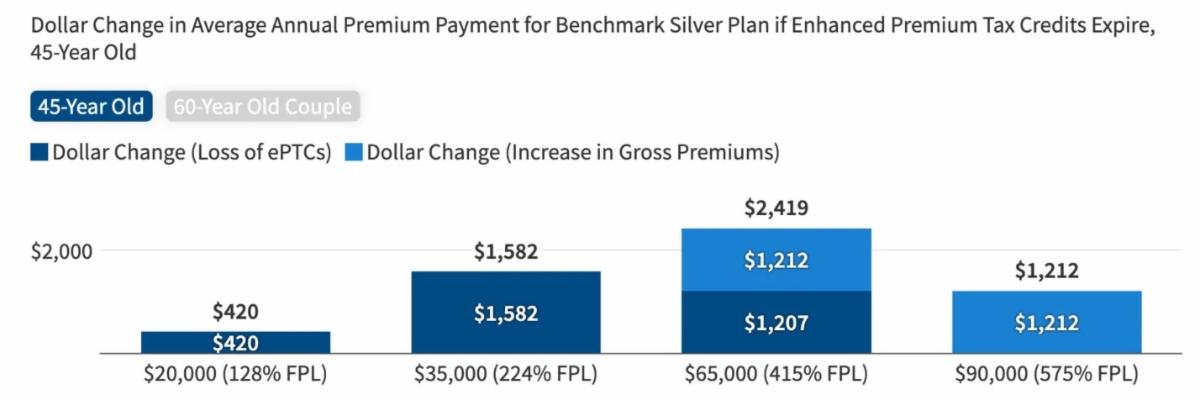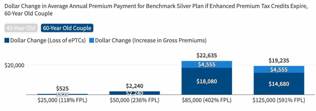 Due to the failure of Congress to renew the expanded Affordable Care Act subsidies in this summer's budget bill, H.R. 1, those subsidies will expire on January 1st, leading to massive premium increases for millions of Americans. Economist Paul Krugman has a good, short discussion of the issue here, in which he points out that prices will go up in two ways - first, the loss of the subsidy, and second, an increase in premiums as healthy people forego unaffordable coverage, thereby worsening the risk pool. The charts below from KFF show that this will hit older, middle-income Americans the hardest. The numbers along the bottom are annual income, and the bars show annual cost increases resulting from the removal of subsidies combined with premium increases. Among other things, it shows that a 60-year old couple making $85,000 a year will see their premiums increase by a staggering $22,635: