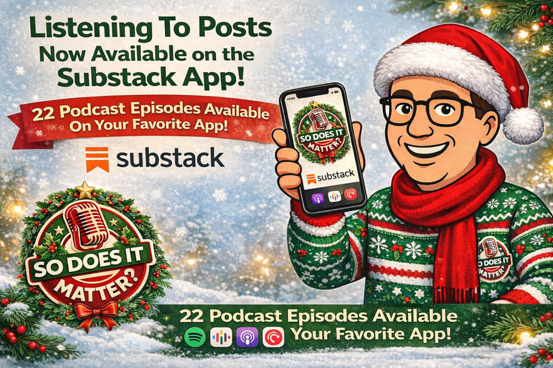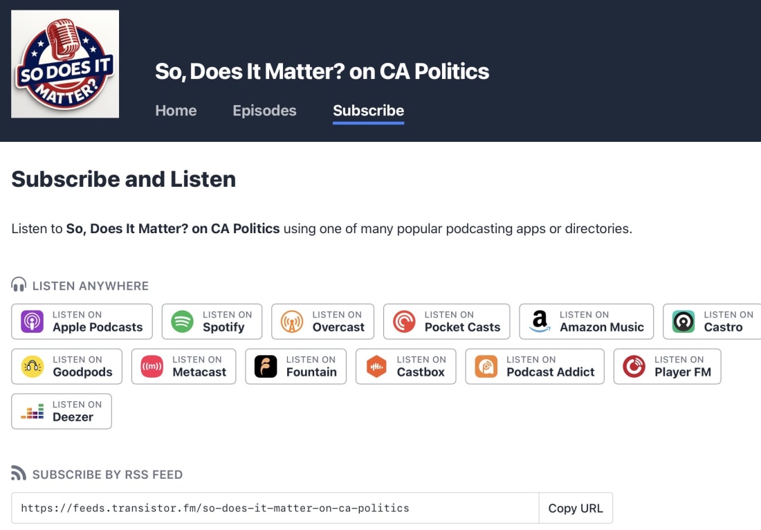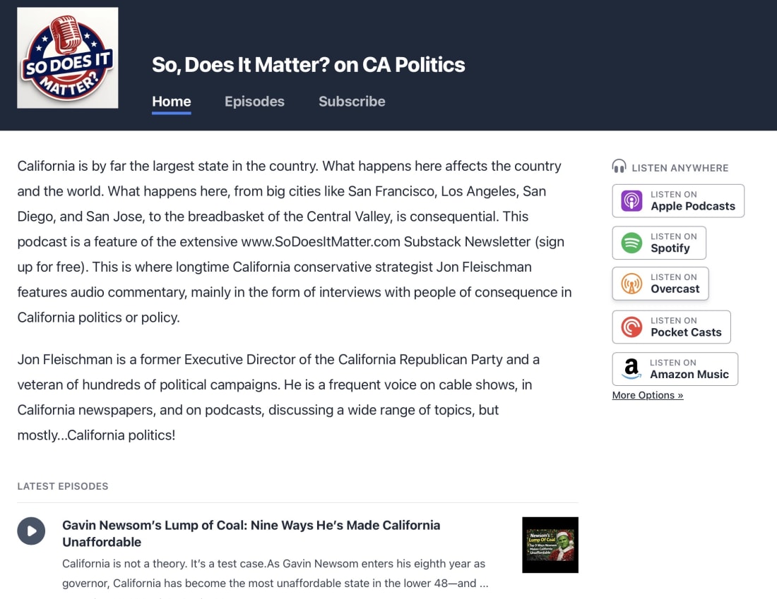 This content is available for free to all subscribers. But you really should consider a paid subscription. This unlocks our afternoon e-mails, our Saturday “What is Jon Reading” e-mail, and analysis on breaking news. Normally a subscription is a modest $7 a month or just $70 for the year. SDIM Podcasts Now Online, and How to Listen To All Our Content…We’ve now uploaded all 22 of our past podcasts, so that you can go back and listen to anything you may have missed!Listening To Regular PostsWhen we conducted our reader survey, one of the requests we got most common was that people wanted an option to listen to our content (in the car, at the gym, on a run or a walk, etc.). This is a quick note to let you know that while we post up our podcasts right here on Substack (video and audio) and on YouTube, that if you prefer to take in your content aurally, that we have you covered. Our regular posts can be listened to, but it does require you to use the Substack App. If you don’t have that already, you can download it from the App Store (Apple, Android, etc.). Once you have done that you will see my content (you can easily search or it too) — you will see a play button at the top. And you are all set! Here’s an image to help you out. Podcasts!We’re now up on all of your favorite podcasting apps (with one exception). I manage my podcasts through Transistor and they have a great page you can visit and from there you can go to any to your favorite service and just search or “So Does It Matter” and I will come up (there is an old feed you do not want, and it’s clearly labeled old feed - you will see the right one). You can get to the Transistor Dashboard here! Here’s an image. You can listen here or click on the “Subscribe” option… When you click on the “subscribe” option you get big choices. These buttons will take you to the SDIM podcast page in that App. Here’s are your choices! I you happen to use Overcast, please be patient. I have had some issues and right now it wants to go to the old feed which is not the right one. The situations should resolve itself sooner than later! THANK YOU or being a part of the So, Does It Matter? Website on CA Politics experience. I hope you are enjoying it as much as I am enjoying producing it. You can always give me feedback — here’s a button. Especially if you have ideas on how to improve what we’re doing! Hope you and yours are enjoying the holiday season! Jon You’re currently a free subscriber to So, Does It Matter? California Politics! For the full experience, upgrade your subscription. See how much more you get with an inexpensive, paid subscription, but clicking the button below! Support me in providing hard-hitting, clear-eyed analysis of California politics. I am beholding to no one, and sugar-coat nothing! |