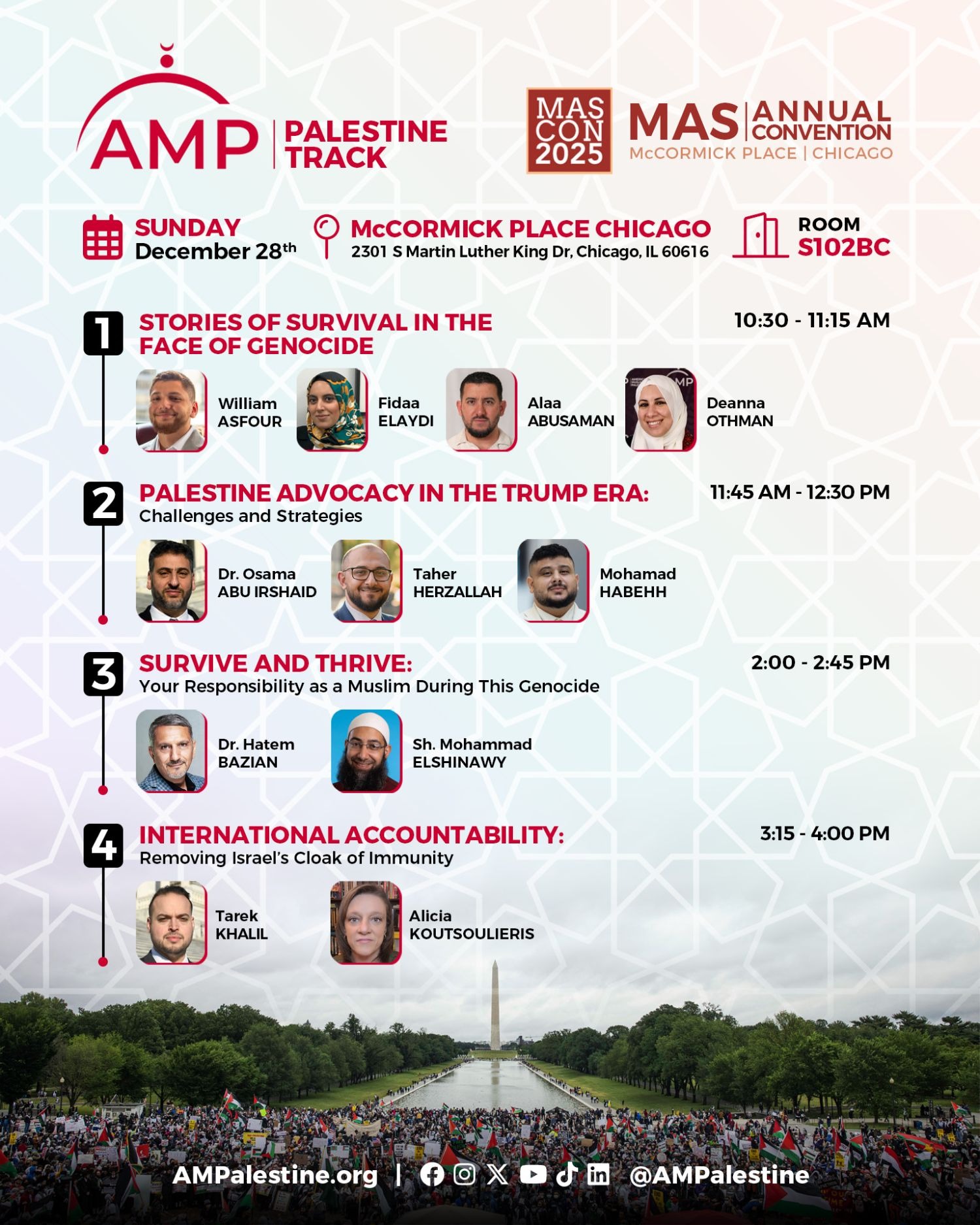 Don’t miss Palestine-focused sessions and our booth Dear Email, AMP is proud to announce our participation in this year’s MAS Annual Convention in Chicago, IL, from December 26- 28. Our team has organized an entire track of sessions focused on Palestine advocacy and campaigns for all convention participants to enjoy. Our booth, located front and center in the convention bazaar, will also feature its own program. Join us throughout the day at booth 458 to win prizes, collect merch, and meet our team! AMP’s Palestine Track at the convention will be on Sunday, the 28th, on Level 1, Room S102BC 10:30 AM - 11:15 AM Stories of Survival in the Face of Genocide Listen to speakers share the stories of survival from Palestinians in Gaza, highlighting resilience, loss, and hope amid the ongoing genocide. Through personal narratives, participants will hear how individuals and families endure unimaginable hardship while preserving their humanity and culture. Beyond survival, the session explores visions for rebuilding, healing, and liberation. Speakers: William Asfour, Fidaa Elaydi, Alaa Abusaman, Deanna Othman 11:45 AM - 12:30 PM Palestine Advocacy in the Trump Era: Challenges and Strategies Under the Trump administration, the Palestine movement has sustained numerous setbacks and faces major challenges, just as there are real opportunities available to it if they are invested in wisely. The session will examine the shifting dynamics of Palestine advocacy in the U.S., the impact of policy changes, the legal challenges organizations face, and strategies for navigating an increasingly hostile environment all with the backdrop of the worst crimes against humanity being committed in Gaza. Speakers: Dr. Osama Abuirshaid, Mohamad Habehh, Taher Herzallah 2:00 PM - 2:45 PM Survive and Thrive: Your Responsibility as a Muslim During the Genocide This session invites Muslims to reflect on their sacred responsibility toward Palestine, not only as an act of solidarity but as a profound expression of faith. We will explore how standing for justice in Palestine nourishes the soul, deepens ones spiritual connection, and fulfills a religious obligation rooted in the Qur’an and Sunnah. Speakers will reflect on how to transform grief and anger over the genocide into steadfastness, hope and prayerful action. Speakers: Dr. Hatem Bazian, Shaikh Mohammad Elshinawy 3:15 PM - 4:00 PM International Accountability: Removing Israel’s Cloak of Impunity For the first time in its history, Israel has been put on trial thanks to South Africa’s application to the International Court of Justice (ICJ). The most esteemed international human rights organizations, Amnesty International and Human Rights Watch, have concluded that Israel’s actions in Gaza amount to Genocide. The main architects of Israel’s genocidal campaign, Prime Minister Netanyahu & former Defense Minister Yoav Gallant, are wanted for War Crimes and Crimes Against Humanity by the International Criminal Court (ICC). The discussion will lay out the meaning of Genocide and Apartheid, and how we can move the needle on finally achieving accountability. Speakers: Tarek Khalil, Alicia Koutsoulieris Beyond the AMP-organized track at the MAS convention, some sessions include AMP’s leaders, including: Friday, December 26: 11:45 am - 12:30 pm The Cost of Self-Centeredness: Abandoning the Ummah in the Age of Hyperindividualism Level1- S101 Speakers: Raja Abdulhaq, Mohamad Habehh 2:00 pm - 2:45 pm The Arabian Gulf After Gaza: Power Shifts, Social Changes, and the Struggle for Justice Room: Level 1 - S103D Speaker: Dr. Osama Abuirshaid 3:15 pm - 4:00 pm Exposing and Overcoming the Pro-Israel Lobby’s Use of Anti-Muslim Hate to Keep Americans Distracted Room: Level 1 - S105BC Speakers: Dr. Osama Abuirshaid, Nihad Awad, Edward Mitchell, Khaled Beydoun Saturday, December 27: 2:00 pm - 2:45 pm Standing Firm: Lessons from The Greats, GAZA & Else Room: Level1- S101 Speakers: Dr. Hatem Bazian, Hussain Kamani 3:15 pm - 4:00 pm Intimidating the Community — Silencing the Brave Voices Advocating for the Ummah Room: Level 1 - S105BC Speakers: Nihad Awad, Esam Omeish, Dr. Osama Abuirshaid Sunday, December 28: 3:15 pm - 4:00 pm Transformations in the United States Toward the Palestinian Cause: Reality, Prospects, and Strategic Investment Level 3 - Hall B Speakers: Dr. Hatem Bazian, Dr. Osama Abuirshaid In solidarity, American Muslims for Palestine (AMP) |