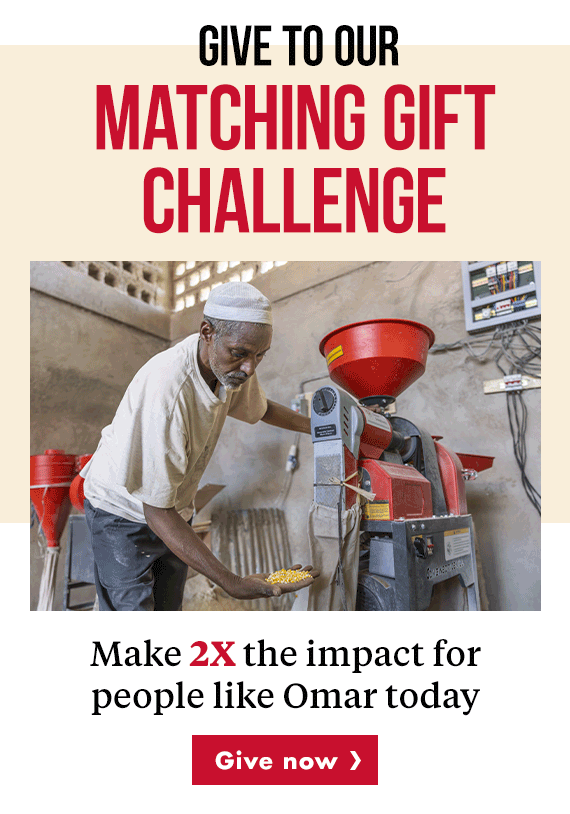 Thanks to an anonymous donor who has contributed $500,000 to encourage others to give, every donation from now until December 31 will be 2X matched. Contribute to our Matching Gift Challenge today and TWICE as far for families in need today ▸ With support from people like you, Omar was able to relocate his business from a small shack to a Mercy Corps-supported hub with a dependable source of electricity and new energy-efficient milling machines. With a reliable source of energy, business has improved. Overall, his income has increased by approximately 30% — helping him pay for his kids’ education. I’ve been able to witness the impact Mercy Corps makes on families, businesses, and communities like Omar. With your gift today, you can help us change the lives of more families in 35+ countries around the world. Donate to our Matching Gift Challenge before December 31, and your gift can go TWICE as far. With gratitude, Tilen Ogola Global Director Mercy Corps |