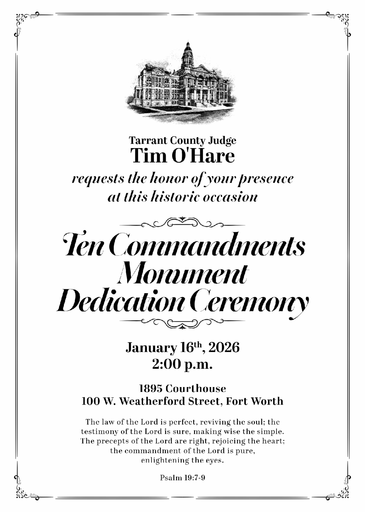 As you're enjoying the end of 2025, go ahead and mark your January calendar! Join us on Friday, January 16th, at 2:00 p.m. for a Ten Commandments Monument Dedication Ceremony on the Southside of the Old 1895 Courthouse. We look forward to this beautiful addition to our Courthouse lawn and hope to see you there. |
