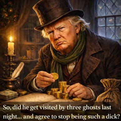 He can resign. Today. And take his name with him. And his ridiculous participation trophy. And the economy that HE BROKE. And the least “Merry” Christmas picture ever. And all the other asinine, evil, and idiotic things he’s done. He can get the hell out of the White House, and let the rest of us begin fixing his mistakes. And let us have our country back. Let’s hope those ghosts were convincing. Merry Christmas, Happy Holidays, and a big THANK YOU to all of you out there working hard to push back against this clownish tyrant, and doing good on so many other fronts to help others in need (including those who helped us!). 💥 Want to do more? 👉 Become a paid subscriber today: |