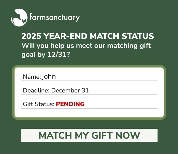 If you’ve already made a gift and this message has been sent inadvertently, thank you for your continued support—friends like you make Farm Sanctuary’s work possible!