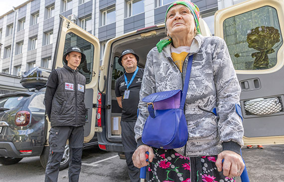 Raisa (name changed), 72, waits at a hygiene kit distribution by a Mercy Corps Ukraine partner organization. She fled her hometown to Zaporizhzhia last year. Photo: Ezra Millstein/Mercy Corps