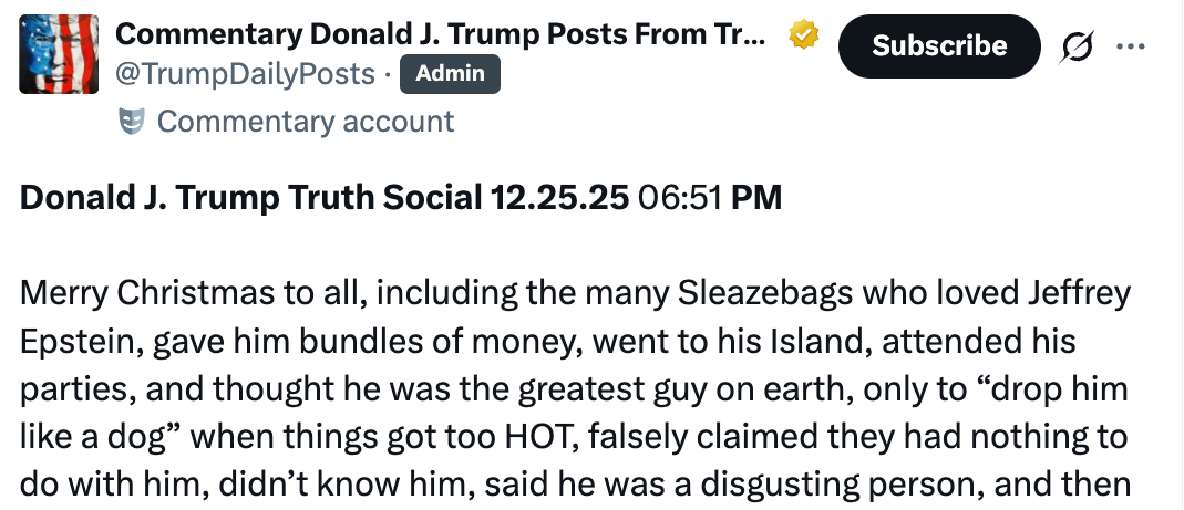 In an unhinged, all caps rant, Trump wished a Merry Christmas to the “many sleazebags who loved Jeffrey Epstein.”