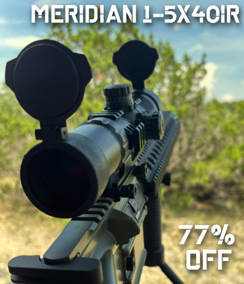 The Meridian uses tri-color illuminated reticle technology (red, green, AND blue) with 1.5-5x variable magnification... giving you sniper-school precision that eliminates visual fatigue in any conditions.
