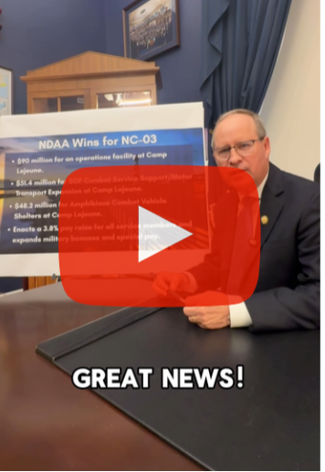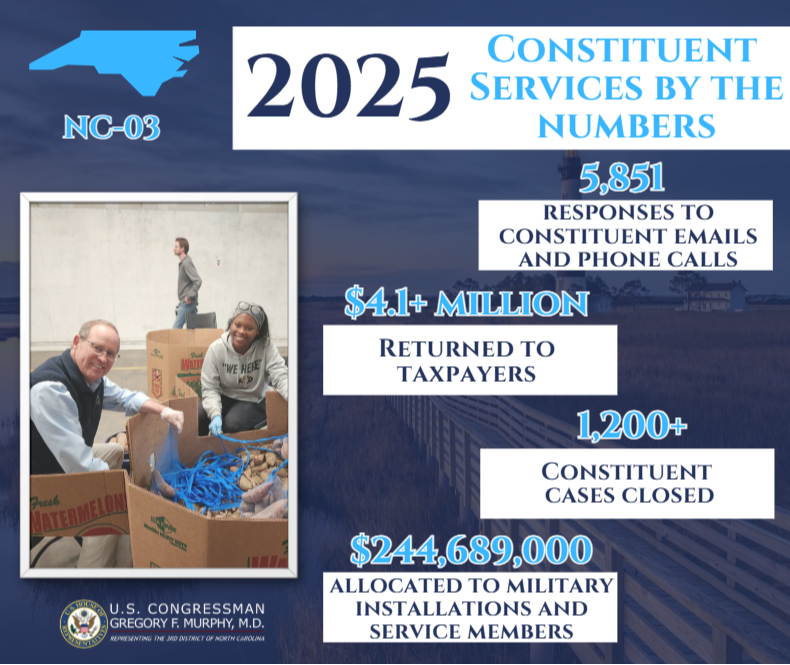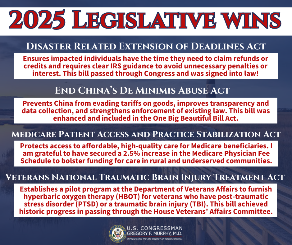 I am delighted to share my 2025 legislative wins as I worked hard to craft legislation that meaningfully addresses the most important issues facing you, Eastern North Carolina, and America.