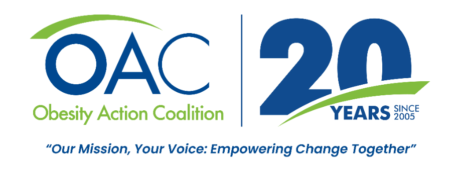 | Follow Us on Social Media! | The Obesity Action Coalition (OAC) is a national nonprofit organization dedicated to elevating and empowering individuals affected by obesity through education, advocacy and support. We work to raise awareness of and eliminate weight bias and discrimination in healthcare, education, media and the workplace; fight to improve access to science-based treatment and care of obesity for those who choose to seek it; and provide support through education and community events. LEARN MORE |