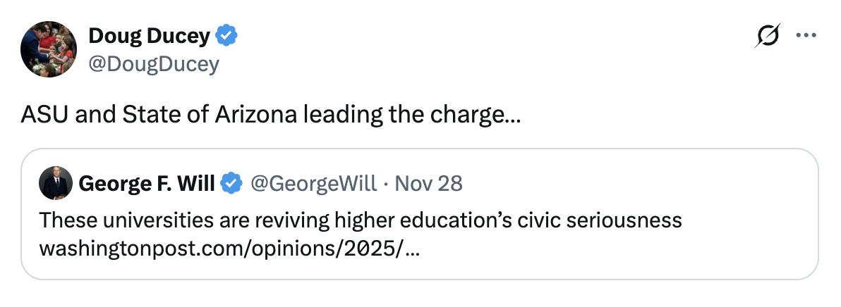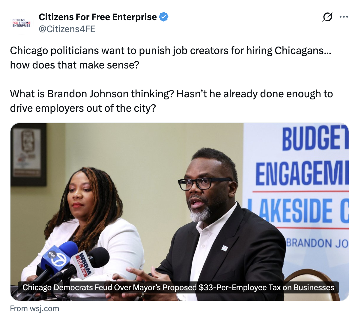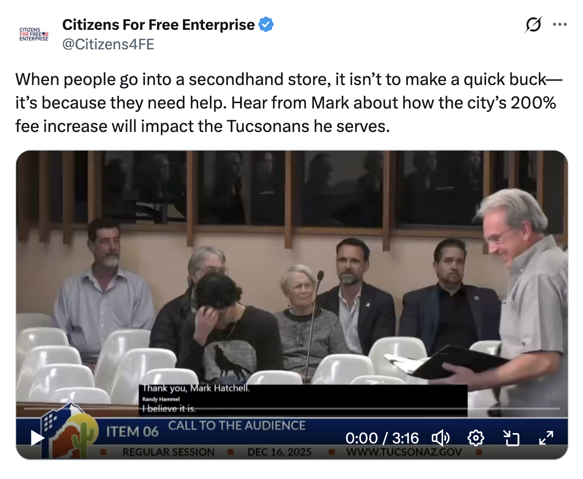 First, I want to wish everyone a Merry Christmas. It was a great time for us to spend time with our family and I hope everyone had a good time surrounded by family and friends as well. Even during the holidays, Citizens for Free Enterprise has been busy. CFFE's Arizona team organized local second-hand store owners and operators in Tucson to go to the city council meeting and oppose a 200% increase to the city's reportable transaction fee. This proposal would have substantially increased costs on vulnerable Tucsonans who rely on second hand stores to make ends meet. We also blasted Chicago Mayor Brandon Johnson for his latest bad idea: punishing job creators for hiring Chicagoans. Johnson is seeking to create a monthly “head tax” that will fine businesses for hiring people. Hasn't he already done enough to drive residents, businesses, and good-paying jobs out of the city? I also want to encourage you to take a moment to read this new piece from George Will. He praises the colleges and universities across the country who are reviving civics education. Leading the charge: ASU's School of Civic and Economic Thought and Leadership. We were proud to ignite this revolution in 2017 and I'm proud to see states and universities across the U.S. following Arizona's lead. Citizens for Free Enterprise CEO & 23rd Governor of Arizona Paid for jointly by Citizens for Free Enterprise and Citizens for Free Enterprise Action. Citizens for Free Enterprise and Citizens for Free Enterprise Action are separate and distinct organizations. Not paid for by any candidate or candidate's committee. To unsubscribe from Citizens For Free Enterprise, click here