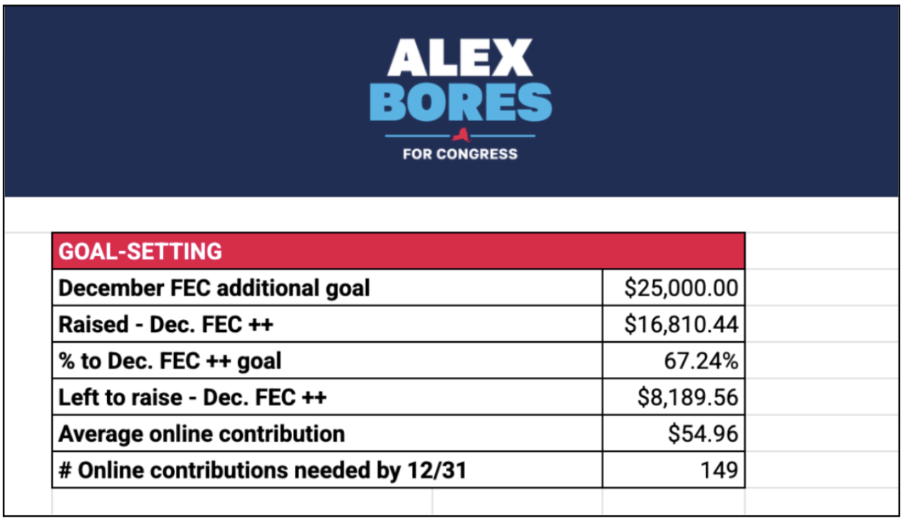 Just 36 hours left in 2025 (🙌), which also means just 36 hours left until Alex’s first FEC deadline of this race. He reached out yesterday about why this deadline is so important, and to share that we’re trying to bring in an additional $25,000 online before we close the books. Here’s where things stand on that goal — and yes, this is our actual internal tracking spreadsheet. Transparency is a good thing! |