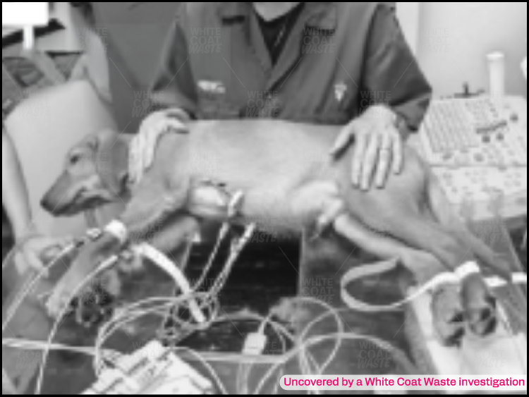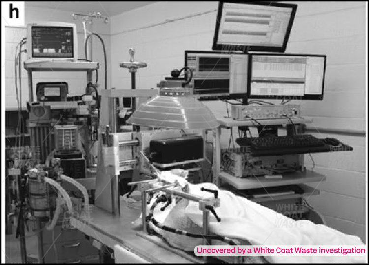 The dog’s limbs are strapped to a machine. Her nerves are exposed.