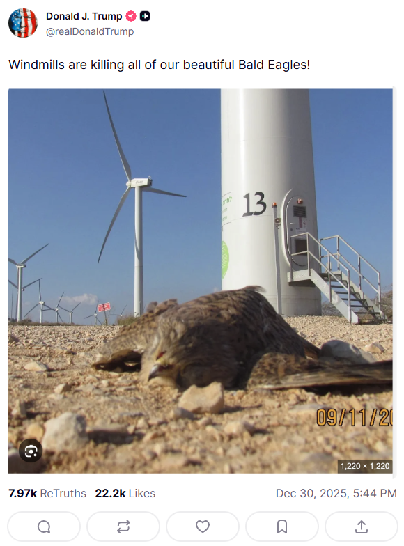 The President shared this image of a dead falcon in Israel as evidence of his bias against wind power. While birds do sometimes collide with wind farms, far more collide with buildings or are killed by house cats. |