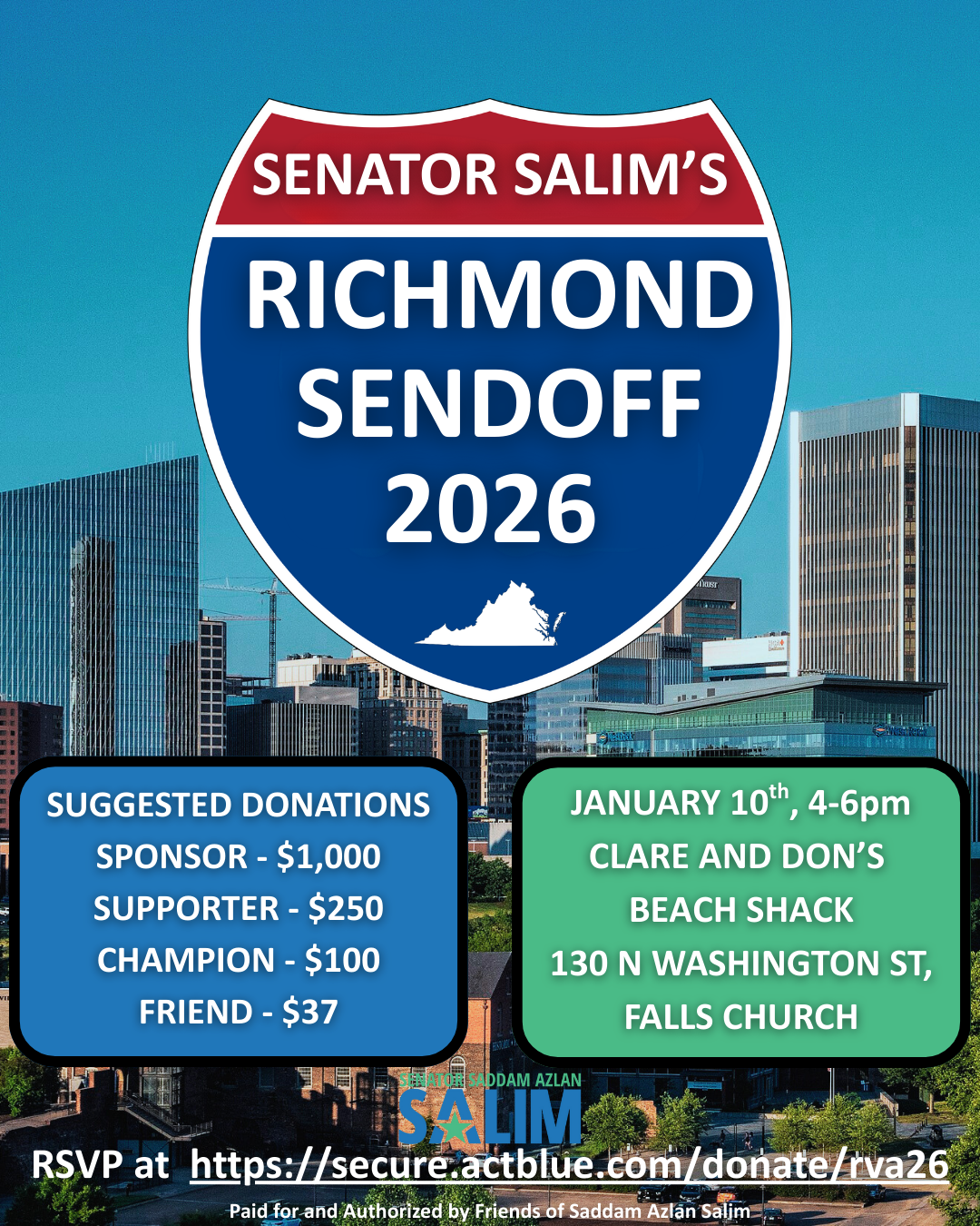 Senator Salim's Richmond Sendoff 2026 Saturday January 10, 4-6pm Clare and Don's Beach Shack 130 N Washington St, Falls Church Learn more and RSVP here. |