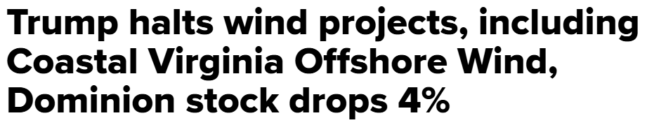 Last week, President Trump ordered a halt to construction on 5 offshore wind projects, including Coastal Virginia Offshore Wind. The official explanation offered was that they are a national security threat. |