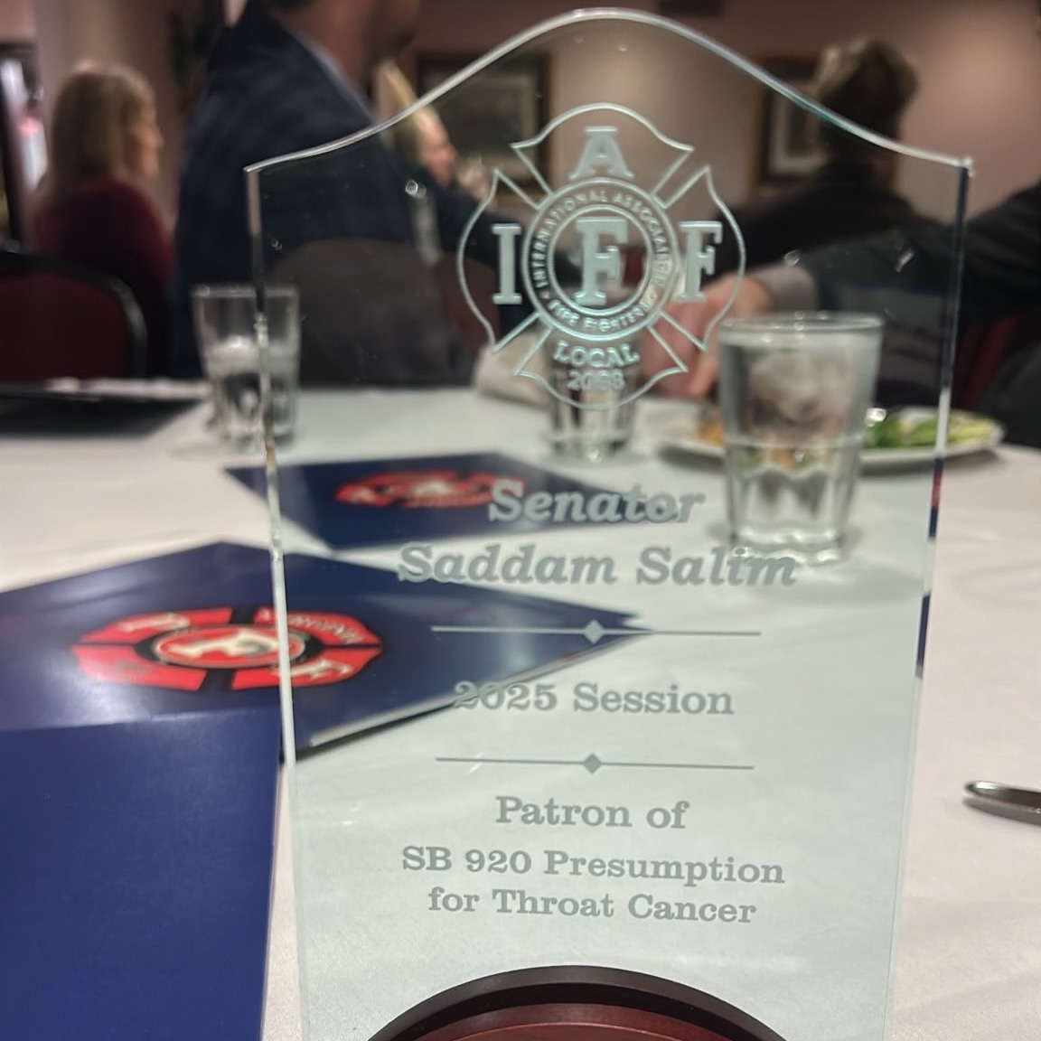 At the annual Tom Simcoe luncheon, my new District Director, Rose Lumpkin, received an award on my behalf recognizing the passage of my bill, SB 920, creating a presumption for worker's compensation for firefighters diagnosed with throat cancer. |
