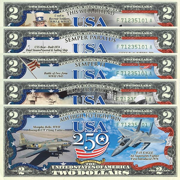 In celebration of America's 250th Anniversary, each military branch is getting their own limited release $2 bill from the mint. There is a special limited edition American Flag Variant being minted. Each American Flag Variant is a limited release and includes an individually numbered certificate, only 250 are ever being sold for each military branch. |