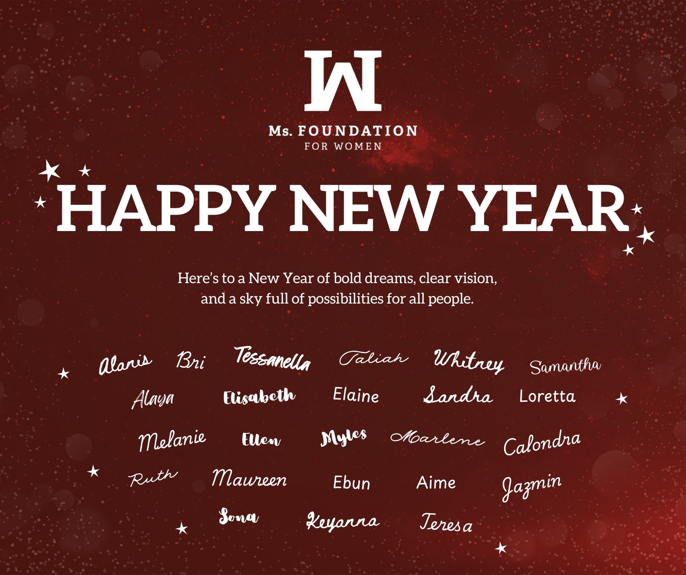 Wishing you a happy new year, from all of us at Ms. Foundation for Women! We hope you’re entering 2026 rejuvenated and healthy. We're energized to continue the work to create a democracy that works for all people by building our collective power, and we're proud to have you by our side. |
