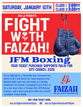 We’re fighting for a Westside that everyone can afford to live and thrive in! Come sharpen your fighting skills and your left hooks in a boxing fundraiser for Faizah’s campaign! Each ticket is for a one hour class of boxing with JFM Boxing trainers, and a meet and greet with city council candidate Faizah Malik. Only 24 tickets available per session, so don’t wait to get your ticket! Go to dsa.la/fightwithfaizah2pm or dsa.la/fightwithfaizah330pm to buy your ticket today! Tickets are a donation to Faizah’s campaign, starting at $43.