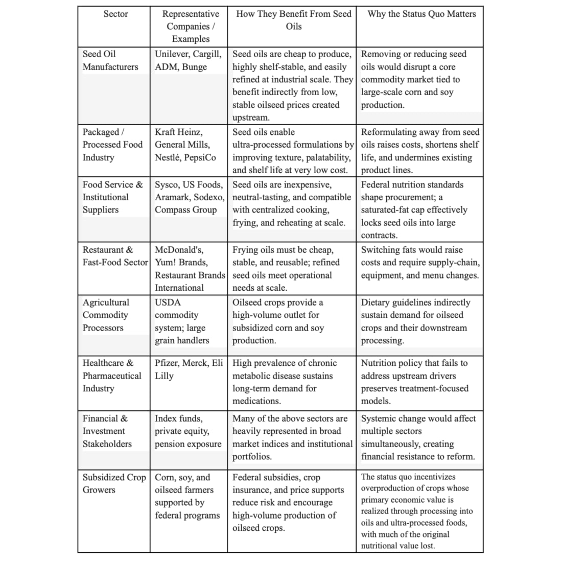 By Cate Shanahan, MD, Special to The MAHA Report A rumor is circulating that the soon-to-be-released U.S. Dietary Guidelines may, for the first time, explicitly acknowledge that industrially refined seed oils are highly processed and potentially problematic. While the final language has not yet been released, even a modest shift in this direction would mark a meaningful departure from decades of guidance that treats these oils as an unqualified nutritional upgrade, particularly when compared to foods like butter and tallow. Such a change will not have come easily. Seed oils are deeply embedded in the modern food system for almost non-negotiable reasons. First, they’re amenable to mechanized farming, and a shift back towards traditional animal fats would necessitate restructuring our agricultural system on a grand scale. Second, they’re vital to the economics of processed food, fast food, and most commercial food establishments due to how cheap they are. Enormous financial interests are tied to their continued dominance. [Data for the above image comes from https://www.soyinfocenter.com] To understand why even tentative recognition of seed oils as problematic has been so difficult to achieve, it helps to start with scale. The first chart, below,shows how the amount of U.S. acreage devoted to growing soybeans (the predominant seed oil in our food supply) exploded during the 20th century, from a marginal crop a century ago to one of the dominant uses of U.S. farmland today. This reveals just how novel the oil is in the human diet, as soybeans were a minor crop in the United States prior to the 20th century. Soybeans have slowly reshaped our entire food production system. First, by serving as a source of industrial engine lubrication for Henry Ford’s automotive industry; later, for the planes, tanks, and guns during WWII. Following the war, soy oil was replaced by petroleum. But we kept growing soy because farmers had started using soymeal to fatten animals faster than grass could do. Today soy meal is also used as a meat extender, or replacement, in numerous processed foods. There was really no market for soy oil, until the American Heart Association started recommending it as a cholesterol-lowering agent. [Discussed in a previous article--maybe you can link to?] Thanks in part to their continuing ideology that cholesterol is harmful, we now eat far more soy oil than we do butter, lard, tallow, and all other animal fats combined. I do not know if the guidelines will define seed oils the same way I do. So, at this point, I want to clarify that there are eight refined seed oils that I’m concerned about: Corn, canola, cottonseed, soy, sunflower, safflower, rice-bran, and grapeseed. (See my previous article for The MAHA Report, here). I borrowed from Quentin Tarantino to coin a catchy term for this collection of problematic oils: The hateful eight. If you’re not already aware of why they might be harmful, I encourage you to visit my website. You can freely read articles telling the story of how scientists used poorly designed studies to convince a trusting generation of dietitians and doctors that saturated fats caused heart attacks, and seed oils prevented them. I also discuss links between seed oils and oxidative stress that dietitians, and MDs like myself, do not learn about during our training. How Previous USDA Guidelines Have Quietly Forced Americans To Eat Seed Oil While you may not look to the USDA Dietary Guidelines for personal nutrition advice, what they recommend still matters to you—and your family. Most seed oil consumption occurs without anyone’s awareness, through packaged foods, restaurant meals, and institutional meals. And a good portion of that consumption is essentially mandated by law. You see, USDA guidelines set the defaults for federal food programs, schools, universities, hospitals, long-term care facilities, correctional institutions, and other environments where people eat what is served to them, not what they select from a grocery shelf. Even individuals who go out of their way to avoid seed oils in their own homes remain affected by these standards the minute they step outside to grab a bite to eat. The second chart estimates just how many people are exposed to seed oils daily in settings where choice is limited because federal guidance directly determines what ends up on the plate. The total estimated captive market is upwards of 50 million. As you can see in chart 2, below, using processed seed oils to make processed foods has been quite a good business model. Chart #2 And remember, we’re not even talking about the fact that seed oils have replaced olive oil, tallow, lard and peanut oil in restaurants, take out, and convenience foods. The total number of people exposed to seed oils daily, often without realizing it, is much higher than 50 million. Could Refined Seed Oils Be Changing What It Means to Be An American? Better data is sorely needed. If you personally avoid seed oil, you may be tempted to think that it’s hardly worth the trouble of fighting huge systems because you’re personally doing just fine. That may be so, for you as an individual. However, we are not islands. We are members of a society. And our society is increasingly disrupted by the burden of sickness. As healthcare systems allocate more resources toward treating chronic illness, fewer resources remain available for acute and emergent care. In practical terms, this means higher costs for everyone, increasing strain on the medical workforce, and reduced availability of timely emergency services—even for those whose own diets are otherwise careful. By calling out seed oils, the new USDA guidance will at least enable us to ask these sorts of questions. And the first step towards making meaningful evidence-based connections between massive changes to our food supply and massive declines in our health as a Nation is better data. You see, in spite of its ubiquity in the food su