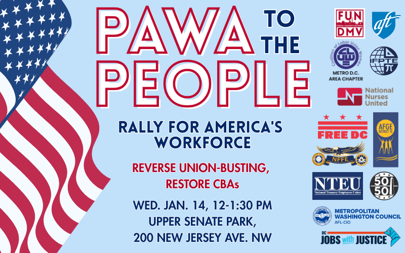 Please join us at Upper Senate Park in Washington, DC on January 14th for PAWA to the People! Speakers include national union presidents, federal union local leaders and rank-and-file members, and members of Congress.
