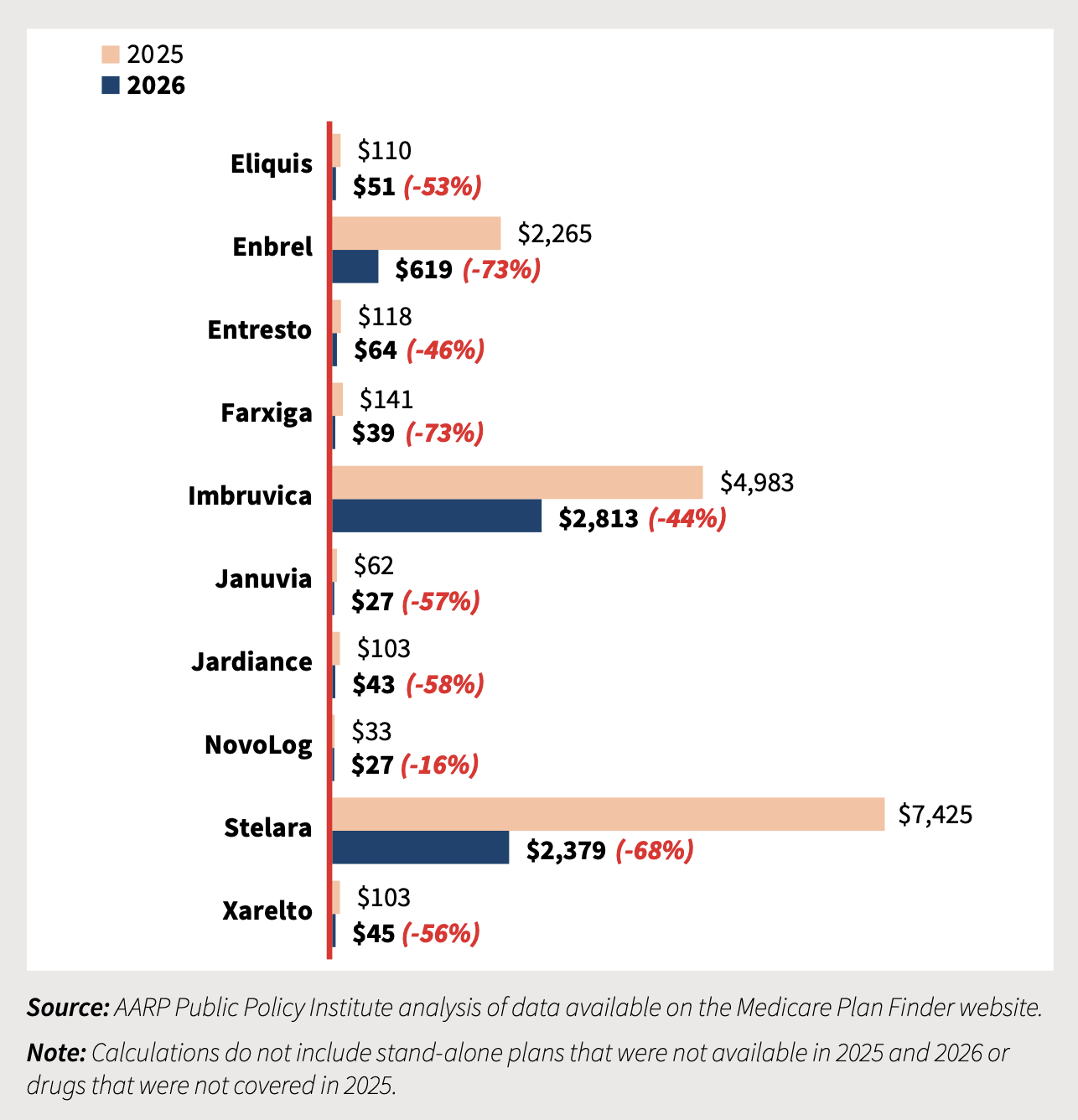 AARP’s analysis also found that seven of the 10 drugs are set to cost less than $100 per month – up from only two drugs in 2025 – once new policies to lower drug prices take effect. While three drugs – Amgen’s rheumatoid arthritis drug Enbrel, Johnson & Johnson and AbbVie’s cancer drug Imbruvica and Johnson & Johnson’s psoriasis drug Stelara – will still have comparatively higher price tags, Medicare Part D beneficiaries will benefit from a new out-of-pocket spending cap of $2,100 in 2026. Additionally, all stand-alone Part D plans included in the study will cover each drug in 2026, representing an increase from current coverage levels.