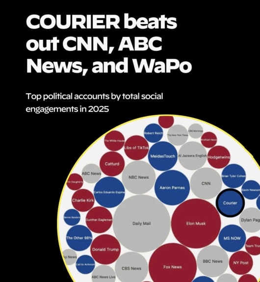 COURIER beat out legacy media outlets in 2025Trump's attacks on Venezuela, the download on J6 rioters now, and moreHi all — As always, thanks for being a part of our 50,000+ community! I hope you all enjoyed the holiday season. As we enter the New Year, COURIER is bringing on exciting new talent. Meet Mason, who you may already know from his account One Hand Politics or from his appearance on Jubilee’s Liberal vs. Maga episode. Check out his first video for COURIER fact-checking Trump’s war on Venezuela: - Charlotte Robertson P.S. If you haven't already, give us a follow on social (like and subscribe to our YouTube, Instagram, TikTok, Bluesky, Threads, and X/Twitter) to make sure you don't miss anything. Will the press continue to keep Trump’s military secrets?The Washington Post and The New York Times kept Trump’s attack on Venezuela a secret — but was it in the public interest? Mark Jacob examines journalists’ decisions to keep Trump’s secrets in Stop the Presses. Domi-nation — and happy J-6 to those who celebrate"Was there ever any doubt that this is where the fetish for 'masculine energy' ... was headed? Soft men with big, hard bank accounts cosplaying tough guys," writes Nina Burleigh in this week's American Freakshow. Two stars, one nomination, and 10 million followersThere’s a big battle brewing in Texas. Guest author Lucy Ritzmann of Open Tabs examines the two young Democratic superstars running for Texas’ Senate seat in the most recent edition of FWIW. Support independent mediaIf you support news without all the bullsh*t, consider making a contribution to COURIER. Together, we can build a more informed, engaged, and representative America. COURIER emerged as one of the top political accounts in 2025, beating out legacy outlets like ABC News and The Washington Post in total social engagements throughout the year. Thank you to our friends at Magnitude Media for sharing this data in a recent edition of What’s Resonating. On COURIER's TikTok, you can see the top post of the week here with 1.4+ million views and 126,000+ likes. On COURIER's Instagram, you can see the top post of the week here with 766,000+ views and 17,000+ likes. Sen. Mark Kelly releases powerful response to Trump threatening himDepartment of War Secretary Pete Hegseth censured Sen. Mark Kelly (D-AZ) after Kelly called for troops not to follow illegal orders. The senator responded to the attacks in a must-watch video shared by COURIER. Many pardoned January 6th rioters have found their way back to jailTrump pardoned rioters who attacked the Capitol on January 6th — but many of them have had continued trouble with the law. COURIER took a deep dive on the fifth anniversary of the Capitol riot. Democrat debunks FOX News’ myths on Trump’s takeover of VenezuelaRep. Jason Crow (D-CO) schooled a FOX News reporter who was defending Trump’s decision to kidnap President Maduro of Venezuela. COURIER has the must-watch interview. Support independent mediaIf you support news without all the bullsh*t, consider making a contribution to COURIER. Together, we can build a more informed, engaged, and representative America. Will 2026 finally be the year paid leave becomes a reality for all Virginians?Democrats and pro-worker advocates hope this can be the year Virginia expands access to paid sick leave and paid family and medical leave to hundreds of thousands of workers. COURIER’s Dogwood has the story. An AI revolution takes hold in the Nevada desertAs tech giants move toward building the world’s largest data center in the state, locals fear the loss of Nevada’s largest natural lake. COURIER’s Nevada outpost, The Nevadan, has the story. Iowa Republicans back Trump as Maduro abduction risks war and regional instabilityIowa politicians are sharply divided after the Trump administration used military force to bomb Venezuela and abduct Venezuelan President Nicolas Maduro and his wife. COURIER’s Iowa Starting Line covers the divide. |