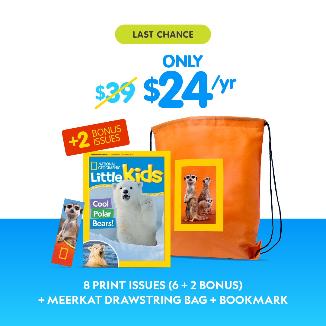 Your gift includes: • Nat Geo Little Kids magazine annual subscription • PLUS: 2 bonus issues Two FREE bonus gifts: • Meerkat Drawstring Bag • Meerkat Bookmark