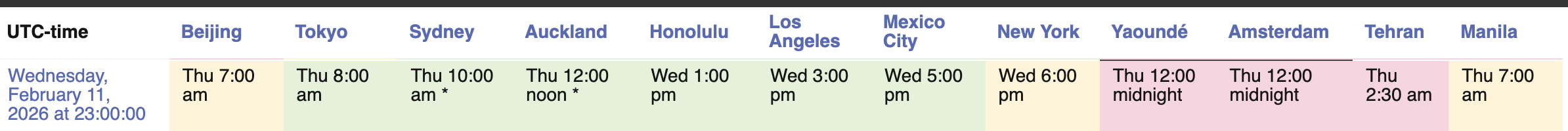 . . . the next day, Thursday, at 7 a.m. in Beijing, 8 a.m. in Tokyo, 10 a.m. in Sydney, and 12 p.m. noon in Auckland.