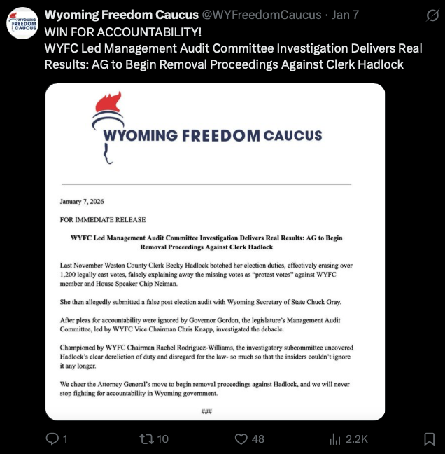 The Wyoming Freedom Caucus continues to prove that your State Freedom Caucuses are not just voting correctly during session—they are watchdogs year-round. Last November, WYFC members publicly called out Weston County Clerk Becky Hadlock for incompetence in carrying out her election duties. Rather than letting the issue fade, they forced it into the open. That pressure paid off.