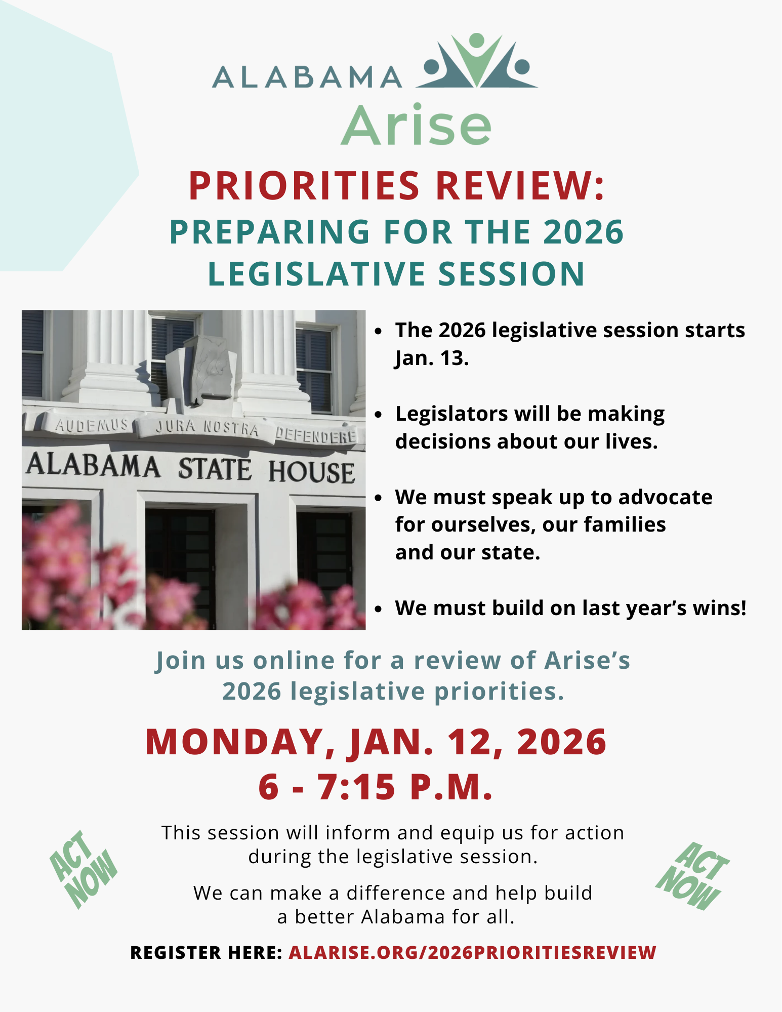 It’s time to speak up at the State House for our families, friends, neighbors and communities. Join us online as we prepare for the 2026 legislative session, which starts next week. We will discuss what we anticipate this year on health equity, hunger relief and other issues and help equip folks to take action. We must continue building on last year’s legislative successes and work toward a better Alabama for all! Priorities review: Preparing for the 2026 legislative session