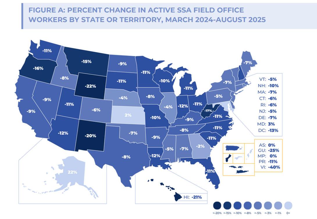 The impact of the staff cuts varies by state. Wyoming, for example, went from one field office worker per 5,814 beneficiaries in March 2024 to one per 7,429 in August 2025, a 28 percent increase in caseload per worker. Hawaii, New Mexico, West Virginia, and Oregon also experienced staffing losses of close to or higher than 20 percent.