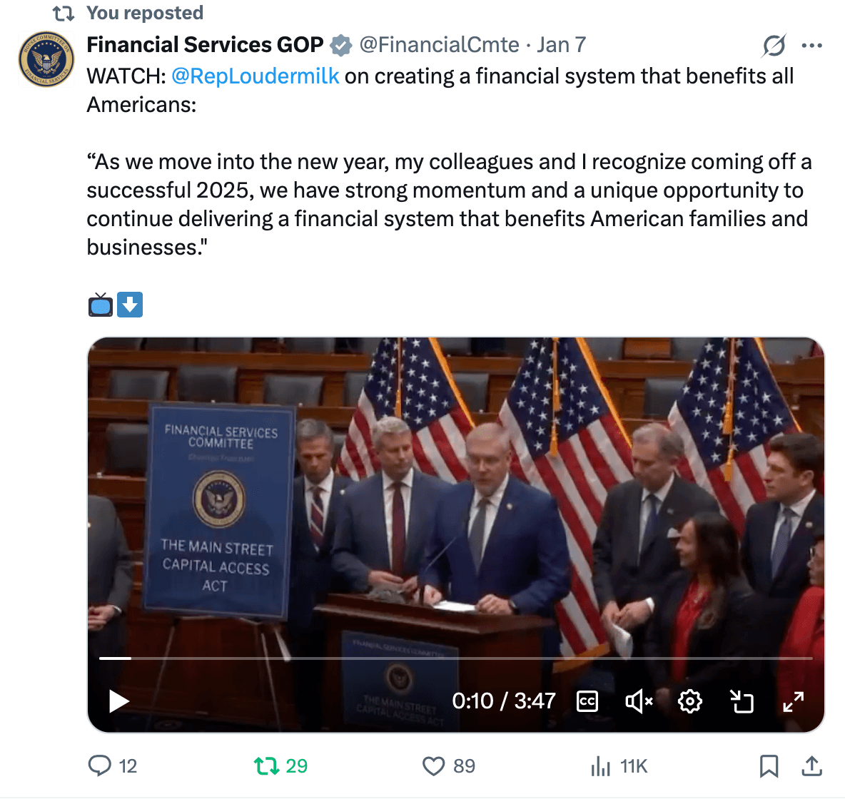 Friends, I hope you are doing well. As your Representative in Congress, it’s a priority to keep you informed of how we're serving you. If you would like to stay up to date, check out our website, and follow our Facebook, Twitter, and Instagram pages. Looking forward to seeing you in Georgia's 11th Congressional District or in Washington, D.C. soon. | Rep. Barry Loudermilk U.S. Congressman, Georgia's Eleventh District | WATCH: Rep. Loudermilk Update On J6 Investigation | Votes This Week: Republicans Vote to Repeal Overreaching Housing Regulations, Pass Government Funding Bills, and Extend ACA Subsidies | H.R. 4593 – SHOWER Act (Sponsored by Rep. Fry / Energy and Commerce Committee) H.R. 5184 – Affordable HOMES Act (Sponsored by Rep. Houchin / Energy and Commerce Committee) H.R. 6983 - Commerce, Justice, Science; Energy and Water Development; and Interior and Environment Appropriations Act, 2026 H.R. 1834 – Breaking the Gridlock Act (Rep. Jeffries Discharge Petition) (Sponsored by Rep. McGovern / Ways and Means Committee) | Rep. Loudermilk Co-Sponsored the Following Legislation, and Co-signed Official Letter | H.R. 6955, the Main Street Capital Access Act, sponsored by Chairman French Hill and Financial Institutions Subcommittee Chairman Andy Barr A package of twenty-nine bills from the House Financial Services Committee that will restore regulatory fairness, transparency and right-sizing, promote a healthy and competitive banking industry, and improve access to funding and capital for small to mid-size banks. This package also includes three of Congressman Loudermik’s bills: Section 102: New BANK Act: Requires the Federal Reserve Board, Office of the Comptroller of the Currency, Federal Deposit Insurance Corporation, and National Credit Union Administration to publish annual reports on applications received for Federal depository institution charters, depository institution holding companies, Federal deposit insurance, and State depository institution charters. Background/Context: The chartering process for a new financial institution like a bank or credit union is multi-layered and complex. Organizers must choose between applying for a national charter or a state charter through the relevant banking authority. The procedural and compliance requirements associated with each of these applications are extensive, and the timeline is often unpredictable. Also, the initial costs are steep – founders may face $30 million or more in combined startup capital and filing expenses before a bank ever opens its doors. Will provide greater transparency by providing essential data on bank charter applications, mean and median approval times, and common reasons for denials for such applications. Section 201: the TAILOR Act Requires federal financial regulators to tailor the scope of their regulations to fit the risk profiles of individual business models. Currently, most regulatory tailoring is done by asset value. This has the unintended consequence of deterring banks from passing key milestones due to the new regulatory requirements that would kick in on the other side, slowing healthy growth. Risk-based tailoring is much more customized approach, allowing banks to take healthy risks and truly innovate. Because the Financial Services industry can’t ‘innovate’ in the same way that a factory might innovate by inventing a new and faster machine or process, much of the innovation depends on adopting new business models. Section 404: American FIRST Act: Requires the Federal Reserve Board, Office of the Comptroller of the Currency, and Federal Deposit Insurance Corporation to include in their respective annual reports information on their respective interactions with global financial regulatory or supervisory forums like the Basel Committee for the purpose of policy standardization, public transparency, and congressional oversight Background/Context: Federal financial regulators, authorized by Congress to oversee participants in U.S. financial markets, must sometimes engage with foreign counterparts due to the global interconnectedness of financial systems. However, this does not grant them unlimited authority to impose domestic regulations under the guise of international cooperation. Regulators are bound by U.S. law and cannot unilaterally negotiate binding international agreements. Federal banking agencies increasingly align with global governance bodies and the Executive Branch over Congress. To restore accountability, H.R. 6550 strengthens oversight by requiring mandatory annual reporting of all regulator interactions with non-governmental organizations Letter led by Financial Services Committee Chairman French Hill to the Federal Reserve Board, Office of the Comptroller of the Currency, and FDIC urging them to move forward with reforming the bank regulatory capital framework, also known as Basel III Endgame, in a manner that is appropriately calibrated, takes into account the potential economic impact, and ensures U.S. competitiveness. As the letter notes, if the framework is inappropriately calibrated, excessive levels of required capital and the associated need for banks to direct available capital to the most productive risk-adjusted uses will likely lead to: increased mortgage costs for homeowners, less business investment, tighter margins for farmers and associated increases in the cost of food, and overall lower economic growth. | Sign Up now! Registrations CLOSING SOON: U.S. Air Force Academy Summer Seminars | The Summer Seminar 2026 application is open from 1 Dec 2025 to 15 Jan 2026. Current high school juniors are invited to apply. The Summer Seminar application can be accessed through the USAFA Admissions website, www.academyadmissions.com, and signing in to their portal account. USAFA is offering the following three sessions: - Session A: June 2-6, 2026 (In Person) - Session B: June 8-12, 2026 (In Person) - Session C: June 15-19, 2026 (In Person) | Jobs & Career Resources A