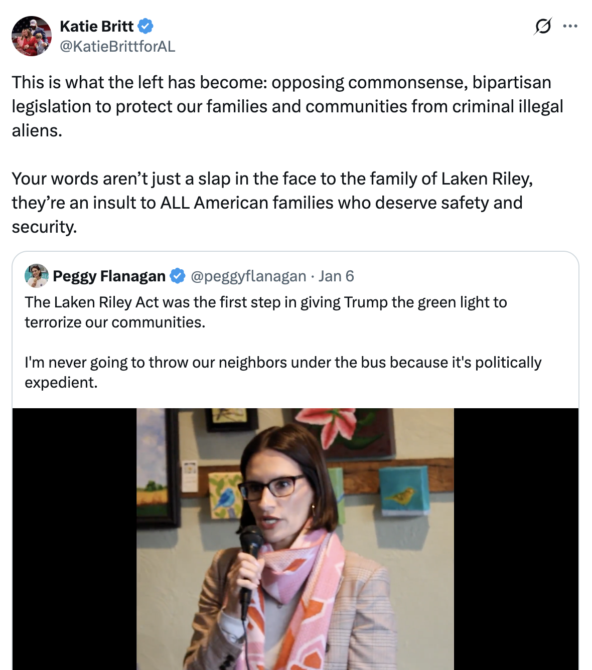 U.S. Senator Katie Britt (R-Montgomery) is calling out the dangerous and irresponsible rhetoric coming from leaders in the Democratic Party after a woman was killed in Minneapolis by an ICE officer acting in self defense.