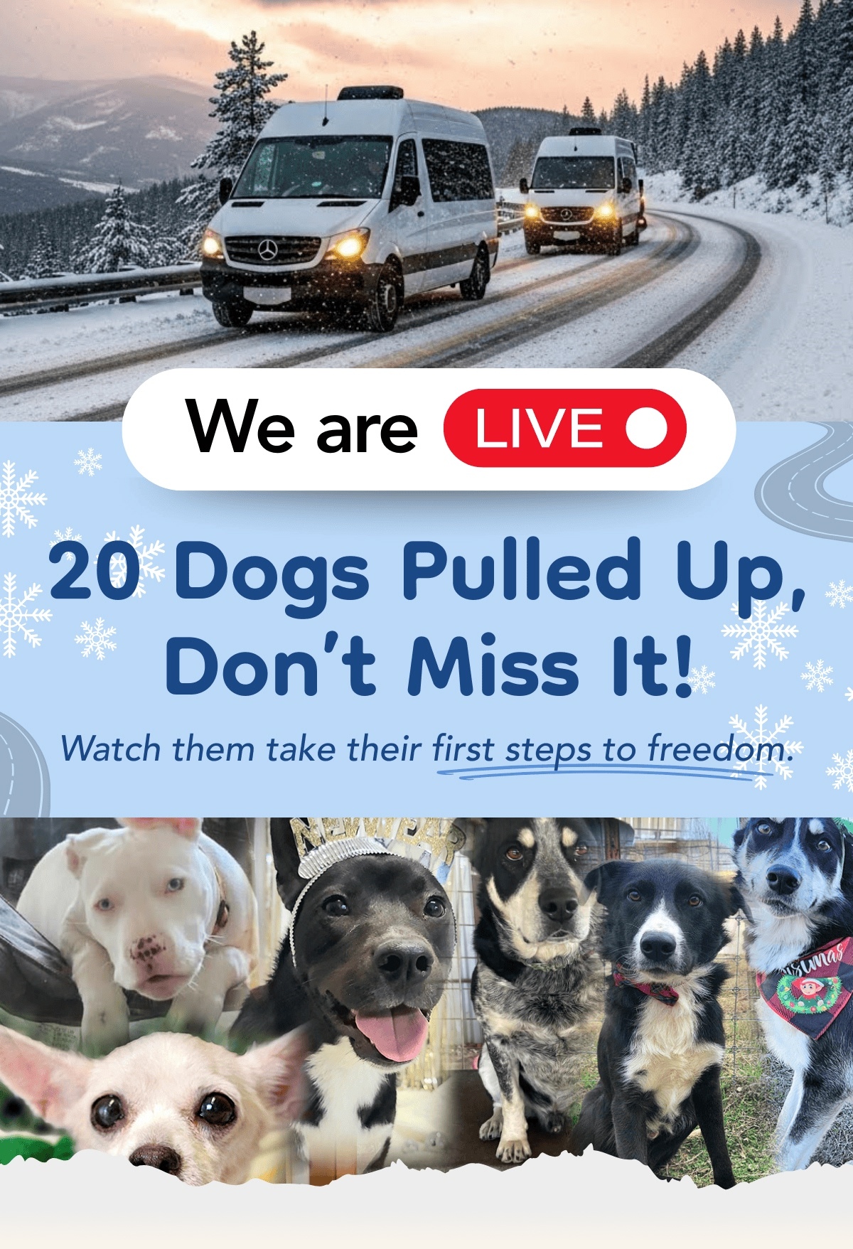 The team is just miles away from the finish line in Colorado after a long, icy drive from Texas. We’re preparing to offload 20 dogs, and we want you to be there for the exact moment they step into their new lives.
