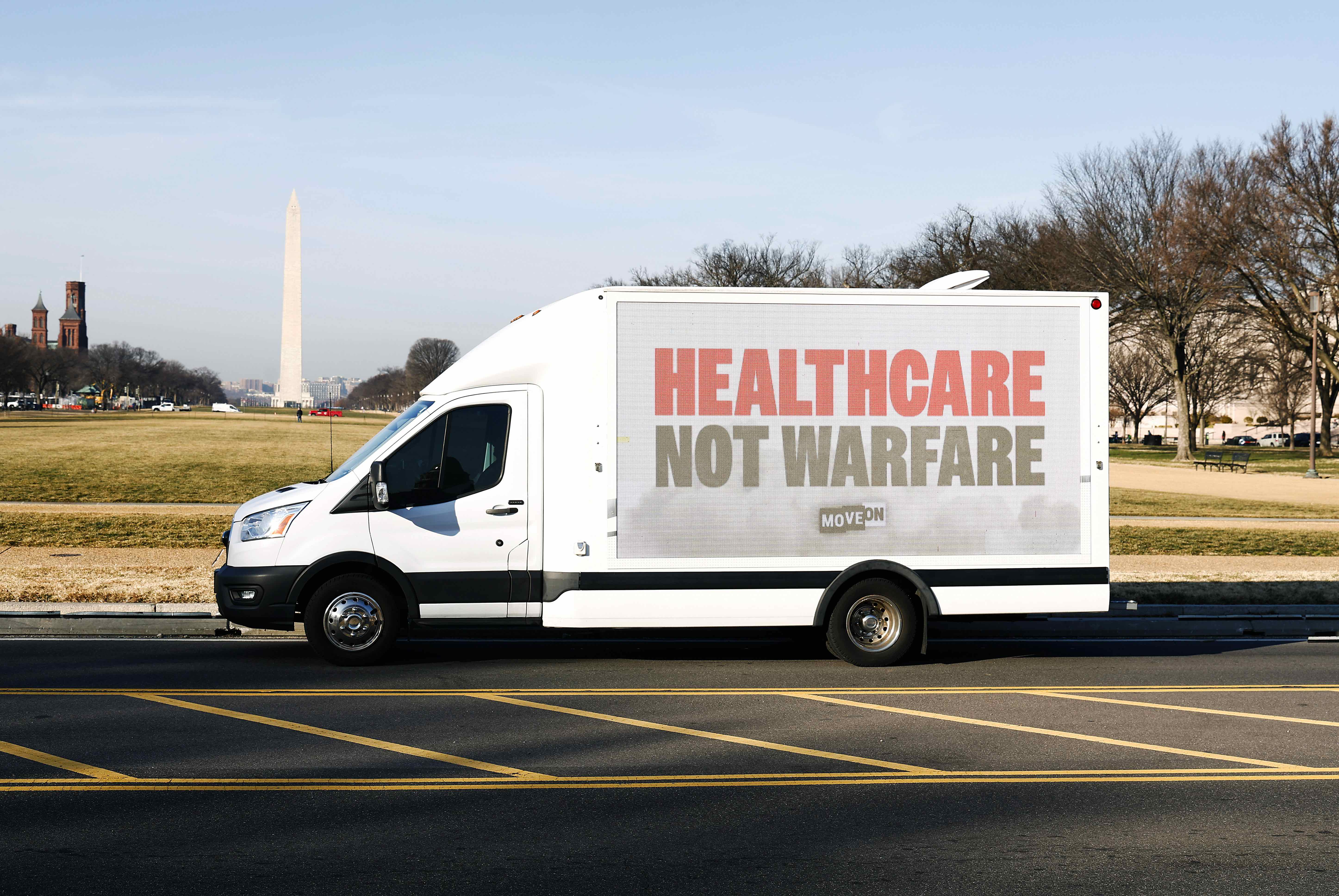 Americans need health care, not warfare. That's why, immediately after Trump's incursion into Venezuela, MoveOn launched a powerful, rapid-response "Health Care Not Warfare" campaign, starting with mobile billboards in Washington, D.C.