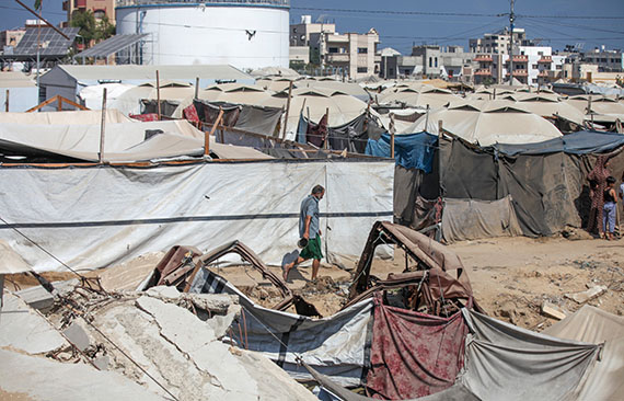 A displaced Palestinian man walks outside his tent after Israeli airstrikes destroyed his home.