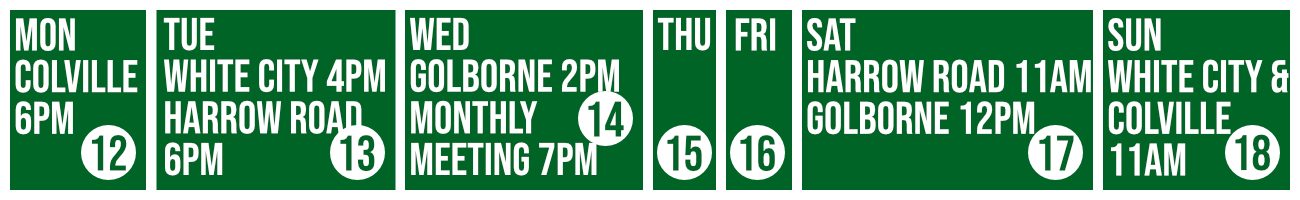 - Tuesday 18:00 - Harrow Road - Maida Hill Market