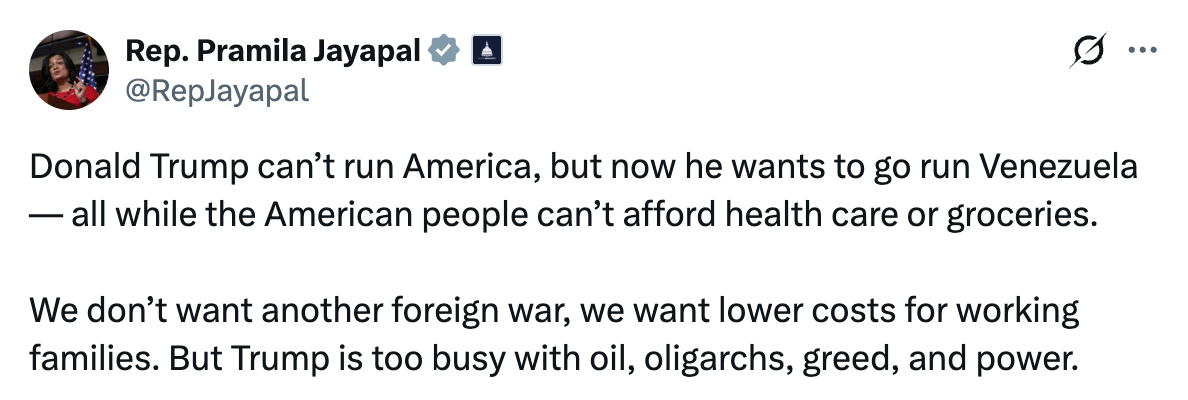 Right now, we’re watching a White House fully aligned with Big Oil make dangerous, reckless decisions. When Donald Trump intervened in Venezuela to chase oil and profits for his cronies, Pramila didn’t stay silent. She spoke the truth plainly: this isn’t about helping the American people. It’s about greed. And it will come at a real cost to working families here at home.