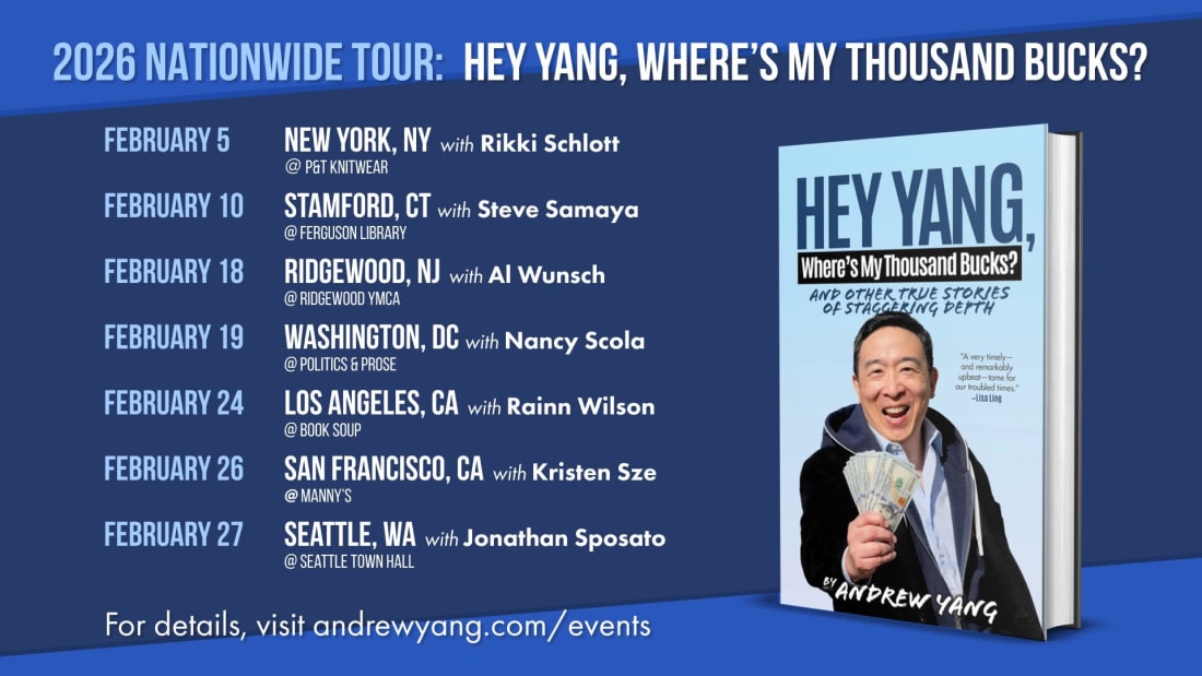 Hello! As you may know, I wrote a book called “Hey Yang, Where’s My Thousand Bucks?” that comes out February 10th. It’s a more personal and humorous account of my rise and fall and rise again to become the emperor. To get you to want to buy the book, here’s an excerpt that recounts my misspent twenties as a young, wannabe entrepreneur. Hope you enjoy! The book is now available for pre-sale and I hope you consider buying a copy. Use code “UBIUBI” for 25% off. And I’ll be doing a book tour to New York, New Jersey, Connecticut, DC, LA, SF, and Seattle so come on out and say hello! Chapter 9 - Swinging and Missing Okay, I’ve been talking a lot about my spare time. What the heck was I doing for work and money in my twenties? Good question. After law school, I was a lawyer at a big corporate firm, Davis Polk and Wardwell. Pretty soon, I had two thoughts: 1. I am getting better at this job. 2. I hate this job. I went home for Thanksgiving to my parents that November and said, “You did not come to this country for me to do this. It’s mind-numbing.” My job at the time involved scouring hundreds of pages of documents looking for issues. “What are you talking about Andy? You have a great job. We are very proud of you.” Ah, Mom. “You shouldn’t be.” I joked with my brother that when we were kids I dreamt of going into the woods and killing a dragon, not being the fucking scribe. So why was I doing this lawyer job? Aside from the fact that I spent 3 years in school for it, it had to be the money. I’ve had something of a funny relationship with money. I guess we all do. My parents were suck-the-meat-out-of-the-bones stingy. My Dad still takes joy out of getting through a day without spending a dime because he’s found some free source of food. When I was a kid, my Mom used to tell me how much everything cost so we would know how much she was spending on my brother and me. “You know how much this costs? You know how much that costs?” When I was a teen, I got fed up. I said to her, “How about this Mom, you can document everything you ever spend on me, and then when I’m older I’ll repay every penny, and then we can never talk to each other again.” She was hurt. “Why are you so mean?” “Okay, then if you’re doing it out of love stop talking about it.” I love my Mom. Anyway, I’ve had a sense that I was going to need to work for money since I was a kid. As a teen I sold knives door-to-door – Cutco – and still remember the sales patter. Did I cut my hand with one of the ultra-sharp knives while cutting a bagel? Yes I did. Those things were a menace. I worked at the school library at Exeter for $6.25 an hour. I was a snack bar worker frying chicken fingers at Josiah’s during my freshman year at Brown. It was interesting how classmates wouldn’t recognize you as soon as you put on a fast food hat and apron. I was a camp counselor during the summers. Looking back, this was probably a little bit excessive. I was a middle-class kid. My parents at one point told me to work less and study more. But I always wanted to make my own money. I was on a partial scholarship to Brown from IBM but my parents often reminded me that they’d taken out a second mortgage on the house. This extended past college into law school. When I was a 2nd year I got a summer associate job at a big firm. We were given a lunchtime reimbursement of $50 if we ate with a current lawyer. I know, it’s a lot of money, and everyone used it to eat at fancy restaurants. One time I went to lunch with a couple of associates and they picked a fairly normal restaurant. The lunch entrees were ‘only’ $17 each, so I ordered two of them. Everyone at the table was like, “What are you doing?” Embarrassed, I said “Oh, I’m just really hungry” when the truth was I just wanted to make sure and spend all $50. Who wanted to leave money on the table? I sensed everyone’s eyes on me. I had to eat two lunches to avoid making it a thing. I moved the items around the dish to make it look done by hiding some remaining food under some mashed potatoes. After law school I owed $110,000 in school loans. The firm I joined paid $120,000 plus a bonus of $45,000 to start. It seemed like an absurd amount of money to pay a 24-year old who hadn’t done anything and didn’t know anything. It was more than my Dad made, and he had generated 69 patents for GE and IBM. I felt like I was way too young to be making that kind of money but also that I shouldn’t feel too committed. I didn’t have kids, a mortgage or even a girlfriend. Whose dreams was I supporting? So I left the firm after five months to try and start a dot-com company. Stargiving.com would raise money for non-profits, where if you clicked on an ad you’d help the charity and then maybe meet the celebrity. My parents thought I was a moron walking away from a six-figure job for my longshot little start-up. Turns out they were right, as we would throw in the towel about a year-and-a-half later. I felt like a failure, lying on the floor of my little bedroom; I had moved in with my old doubles partner Andy to save money and was paying $1,080 a month. I had gone through my savings. My classmates were still making six figures practicing law. I had a net worth of negative $100,000. But I wanted to get better at becoming an entrepreneur. I got a job at a mobile software company that ran out of money a few months later. One of my colleagues moved into the conference room with duffel bags of his stuff and was showering in the office. “You’re living the dream!” I said to him, trying to be positive. He glared at me. I found another job working at a healthcare software company that made health records digital. Given that I’d by then been a part of two companies that had gone under, I started looking for side hustles. I tutored students in standardized tests. I also began promoting parties under the name “Ignition NYC” with a few partners. 