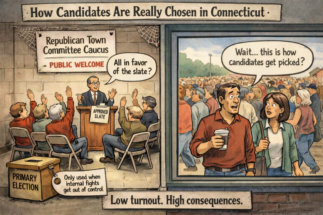 Goldstein For Congress - Please Subscribe and also visit us at www.goldsteinforcongress.com How Connecticut Republicans Actually Choose Their Candidates — And Why It MattersLow Turnout - High ConsequencesJanuary is Caucus Season Throughout most of Connecticut, Republican towns recently held their Republican Town Committee (RTC) caucuses. These caucuses appoint representatives from each town and district to serve on local Republican governing bodies. Despite how consequential this process is, most people in Connecticut have no idea it even exists—or how profoundly it affects who ultimately appears on the ballot. This is the gatekeeping mechanism of local politics. Before anyone can run for office, before a name appears on a primary or general-election ballot, it must first pass through the town committee structure. Each town is divided into districts, and each district is allocated a specific number of RTC seats. Candidates for these seats are technically elected, but in practice turnout is often limited to friends, family, and party insiders who know when and where the caucus is happening. The process itself is antiquated, relying on obscure newspaper notices and minimal public outreach. There is almost no media coverage—Republican or Democrat— the Democratic Town Committees follow a similar system. Collectivism Over Individualism The current caucus system frequently favors collectivism over individualism. Slates are assembled behind the scenes (and sometimes multiple slates), and challengers who have the chutzpah to run independently are often discouraged or opposed. Competition is not discouraged as the rules still allow for competition: if ANY challenger is nominated, seconded, and brings enough people to vote, they can win. Popularity still matters—at least on paper. What’s striking is how small these elections usually are. In most districts, caucus attendance ranges from 15 to 25 people total, including the candidates themselves and their family members. Typically, four to six people are competing for a handful of seats. Occasionally, during moments of genuine grassroots energy, turnout can surge to 75 or even 100 people per district that show up to vote—but that is the exception, not the norm. Over the past several years, many towns have experienced “old guard versus new guard” struggles within their RTCs. These internal battles have produced reversals, takeovers, and sustained infighting. It is a troubling dynamic: people who largely share the same values and principles unable to reach consensus—or unwilling to accept the legitimacy of popular support. If someone can persuade more people to show up and vote for them, why shouldn’t they have a seat at the table? When internal divisions become severe, the caucus can spill into primaries. These primaries are often not driven by ideology, but by unresolved personal or factional disputes that should have been addressed internally long before a ballot was printed. What RTC Service is Not It is also important to understand what service on an RTC is not. Serving on a Republican Town Committee is not the same as serving on a Board of Education or on formal municipal bodies such as taxation, planning, or zoning commissions. RTC members are not setting tax rates, approving developments, or managing schools. An RTC’s role is far narrower and far more political: to participate in the monthly workings of local party governance—endorsements, strategy, messaging, and candidate development and support. When will the fighting end? The broader problem is that the Connecticut Republican Party too often ends up fighting itself. In a state dominated by a Democratic supermajority, internal warfare only weakens an already disadvantaged minority. Every ounce of energy spent battling fellow Republicans is energy not spent challenging Democratic dominance, expanding the party’s base, or developing competitive candidates. How will this year’s caucus shake out? Over the next several weeks, the impact of these caucuses will become clear as the new mix of RTC members settles in across the state. Whether you won a seat, lost one, or never ran at all, the takeaway is the same: local politics matters. These small, overlooked meetings shape the future of elections in Connecticut. You don’t need an appointed vote to make a difference on an RTC—but you do need to show up and bring a few friends to the next RTC Meeting. In the words of Bruce Hornsby - “That’s Just the Way It Is” until the Tonya Hardings and the Nancy Kerrigan’s start fighting for Team Connecticut See the Recent Article on that one: The Goldstein Substack is free today. But if you enjoyed this post, you can tell The Goldstein Substack that their writing is valuable by pledging a future subscription. You won't be charged unless they enable payments. |