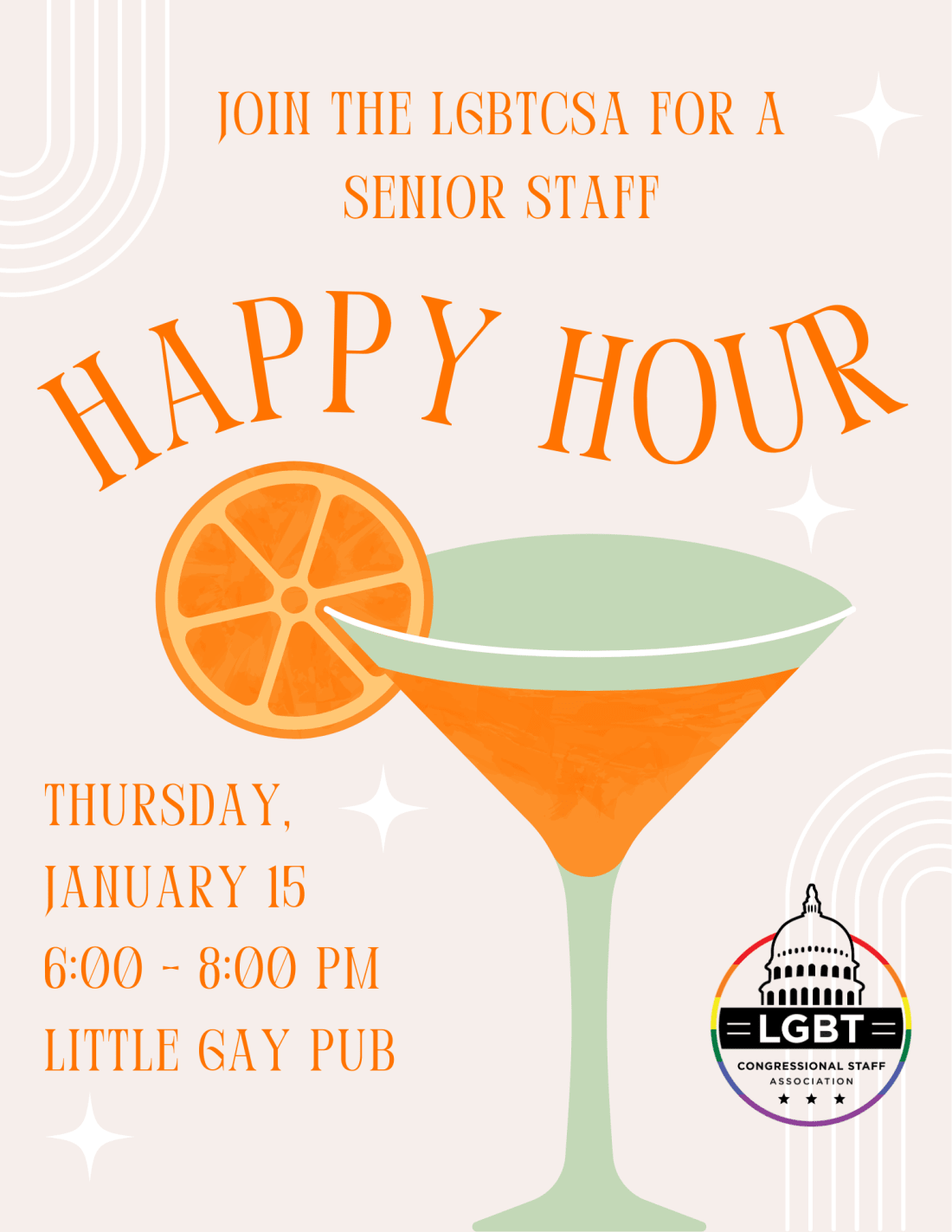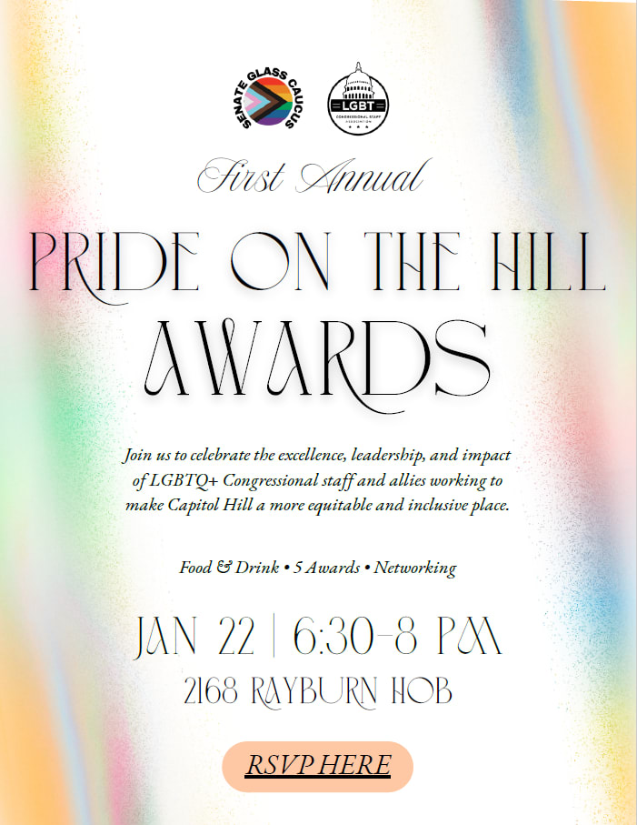 Happy New Year from GLASS! As we head into 2026, we’re excited to kick things off with opportunities to reconnect, celebrate, and look ahead to what’s next for our community. Below are our upcoming events and a few important save-the-dates. 👇 📣 Member MeetingGLASS will hold its next GLASS member-only meeting on Thursday, January 15 from 2:00 – 3:00 PM in SR-318. Members should have a received a calendar invite hold for the meeting. Please let us know if you did not. We hope to see you there! 🍸 Senior Staff Happy HourDate: Thursday, January 15, 2026 Already missing the winter break? Looking for a dedicated space to unwind with other senior staff? Come join in community with other LGBTQ+ senior staff on Thursday, January 15 from 6:00-8:00pm at The Little Gay Pub! We will have a section of the bar reserved for our membership to mingle and reconnect in honor of the start of the new year. Please note that this event is specifically for senior staff of the LGBT CSA, GLASS, and LOC GLOBE. We look forward to seeing you soon! 🏆 Pride on the Hill AwardsDate: Thursday, January 22, 2026 GLASS and the LGBT Congressional Staff Association are proud to host our first annual Pride on the Hill Awards, honoring LGBTQ+ staff and allies whose leadership and service have helped make Capitol Hill a more equitable and inclusive workplace. Award Categories