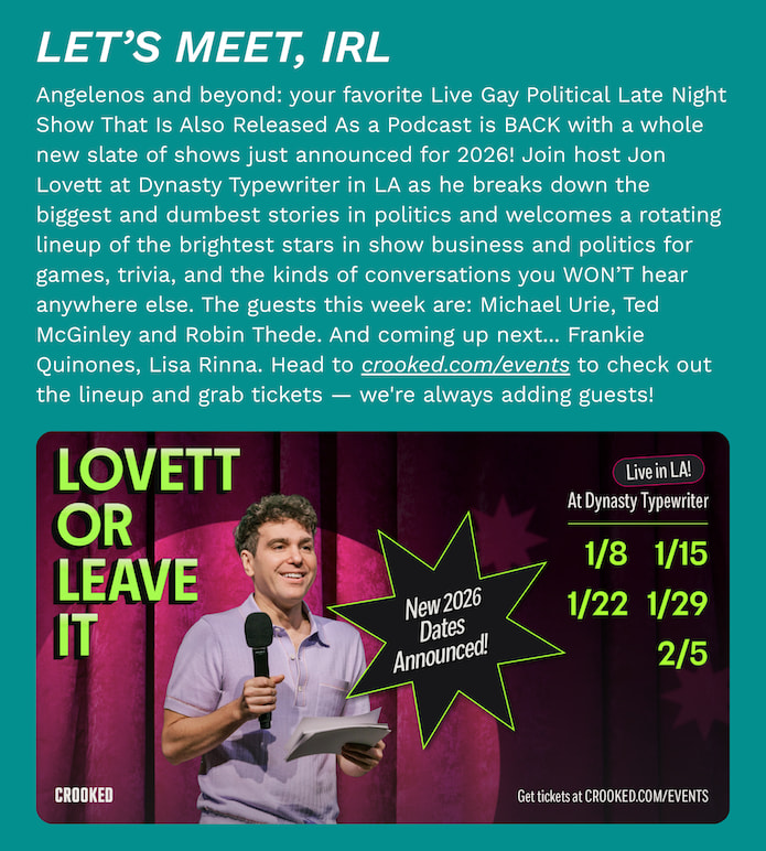“If I were in Congress, I do not know how I could vote to fund this Department of Homeland Security, regardless of the political implications,” Crooked’s Jon Lovett said on Pod Save America. WHAT ELSE? 👀The FBI raided the home of Hannah Natanson, a Washington Post journalist who covers the Trump administration’s attacks on federal workforce. Natanson was “obtaining and reporting classified and illegally leaked information from a Pentagon contractor. The leaker is currently behind bars,” Attorney General Pam Bondi tweeted. Investigators took the reporter’s personal laptop, Garmin watch, and phone, she told the Post. Marty Baron, the Post’s former editor, described the raid as “a clear and appalling sign that this administration will set no limits on its acts of aggression against an independent press.” Related: Natanson recently wrote a first-person account of her reporting, with the tagline: “One reporter’s effort to show how Trump was transforming government brought her 1,169 new sources — and nearly broke her.” The Trump administration and Denmark have a “fundamental disagreement” over the future of Greenland, the Danish foreign minister told reporters after meeting with VP JD Vance and Secretary of State Marco Rubio today. Trump posted an unhinged rant on social media this morning, calling “anything less” than U.S. control of Greenland “unacceptable.” The U.S. withdrew troops from several bases in the Middle East, Reuters reports, after Iran threatened to target them if Trump strikes the country amid a wave of deadly anti-government protests. The State Department will suspend visa processing for citizens from 75 nations, including scores of African and Middle Eastern countries. They’re even going after Barbados? I’d like to hear Rihanna’s take on this BS. The second phase of Trump’s “peace plan” for the Gaza Strip went into effect. This stage involves the “demilitarization and reconstruction of Gaza, primarily the disarmament of all unauthorized personnel,” according to Trump’s special envoy Steve Witkoff. Sen. Elissa Slotkin (D-MI) said she’s being investigated by federal prosecutors over the video she and other lawmakers filmed urging service members to resist illegal orders. “Facts matter little, but the threat matters quite a bit,” Slotkin said. “The threat of legal action; the threat to your family; the threat to your staff; the threat to you.” HHS Secretary Robert F. Kennedy Jr. appointed two vaccine critics, including a self-described “anti-vaxxer,” to a key vaccine advisory panel this week. “My grandchildren will not get any shots if I can help it,” one of those appointees said during a panel discussion two years ago. House Republicans plan to hold both former President Bill Clinton and former Secretary of State Hillary Clinton in contempt for skipping depositions on the Epstein files. A message to House Republicans: You do realize the current president is the one trying to bury all the Epstein evidence, right? 2025 was the third-hottest year on record, according to European Union scientists. LIGHT AT THE END… ☀️The Trump administration apologized for deporting a Massachusetts college student who was flying home to surprise her family for Thanksgiving, telling a judge that it was a “mistake.” But will this federal prosecutor get fired for showing some humanity? TBD. A federal judge upheld California’s new congressional maps, an initiative spearheaded by Gov. Gavin Newsom (D-CA) after Texas Republicans moved to reshape their maps to help Donald Trump. The Ford worker who Donald Trump flipped off after calling him a “pedophile protector” was suspended from his job — but he’s in good spirits. “As far as calling him out, definitely no regrets whatsoever,” TJ Sabula told the Washington Post. “I don’t feel as though fate looks upon you often, and when it does, you better be ready to seize the opportunity … I think I did that.” Trump’s gesture was a blessing in disguise: Two GoFundMe’s for Sabula have raised over $700,000 in the past day. Crooked’s own Jordan Silver and Nina Harris have been hosting a listening club (think a book club, but for podcasts and YouTube videos) to help progressives better understand the right-wing media ecosystem. Check out this profile on the group, called “Unfortunately Not a Sound Bath,” because our colleagues are the bomb. “There have been at least a dozen people who have told us that this club has given them hope in politics for the first time in a long time,” Jordan said. That was definitely not what we thought we were gonna achieve with this.” Check out the group’s Substack here! Scientists in Antarctica are collecting mountain ice cores and preserving them in a repository, so future generations can study them as the climate warms. Think of them as atmospheric time capsules, which will make up a vast archive of the Earth’s geological history. Very cool. One of the rarest (and fattest) parrots in the world is breeding again. Only 236 kākāpō birds — which weigh up to 8 pounds, live up to 90 years, are almost blind, and can’t fly — exist across New Zealand. But the berries they munch, which lead to mating, are plentiful this year, raising hopes that they’ll keep fighting off extinction. You’re currently a free subscriber to Crooked Media. For the full experience, upgrade your subscription. |