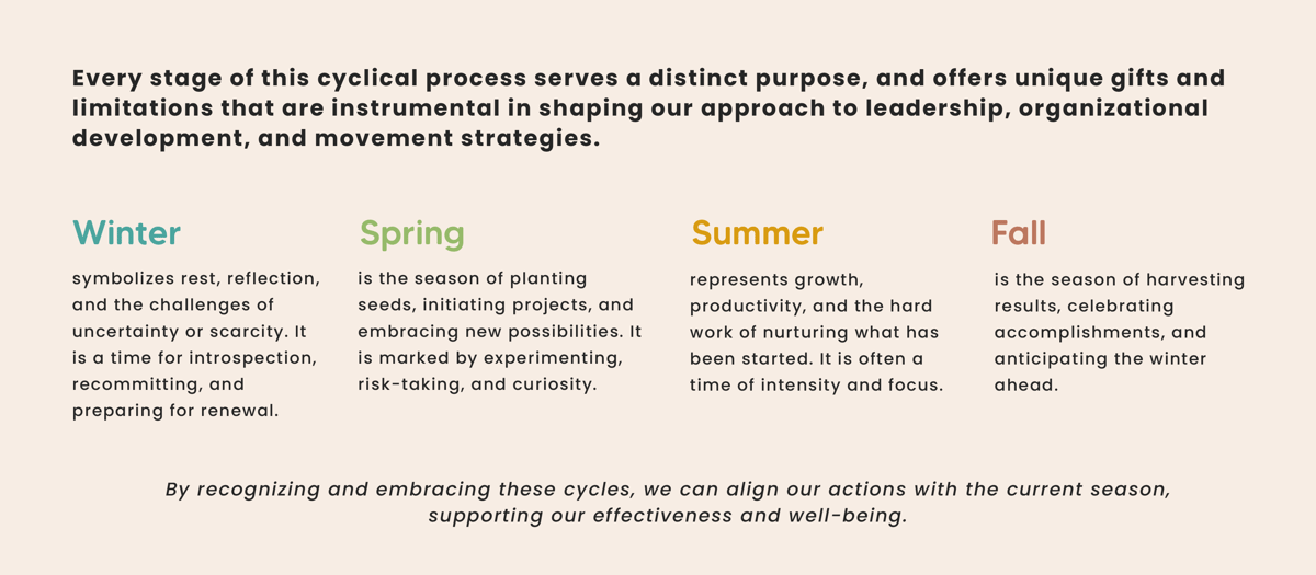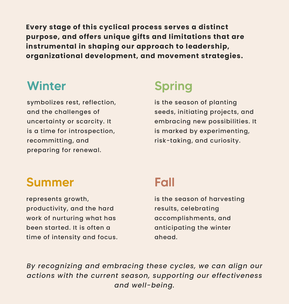 The Seasons framework is drawn from spiritual and Indigenous traditions, and it helps leaders recognize recurring patterns across their lives, organizations, and movements. Instead of constantly asking “What should I do next?” it invites a different question: What is this moment asking of us, and what becomes possible if we meet it honestly?